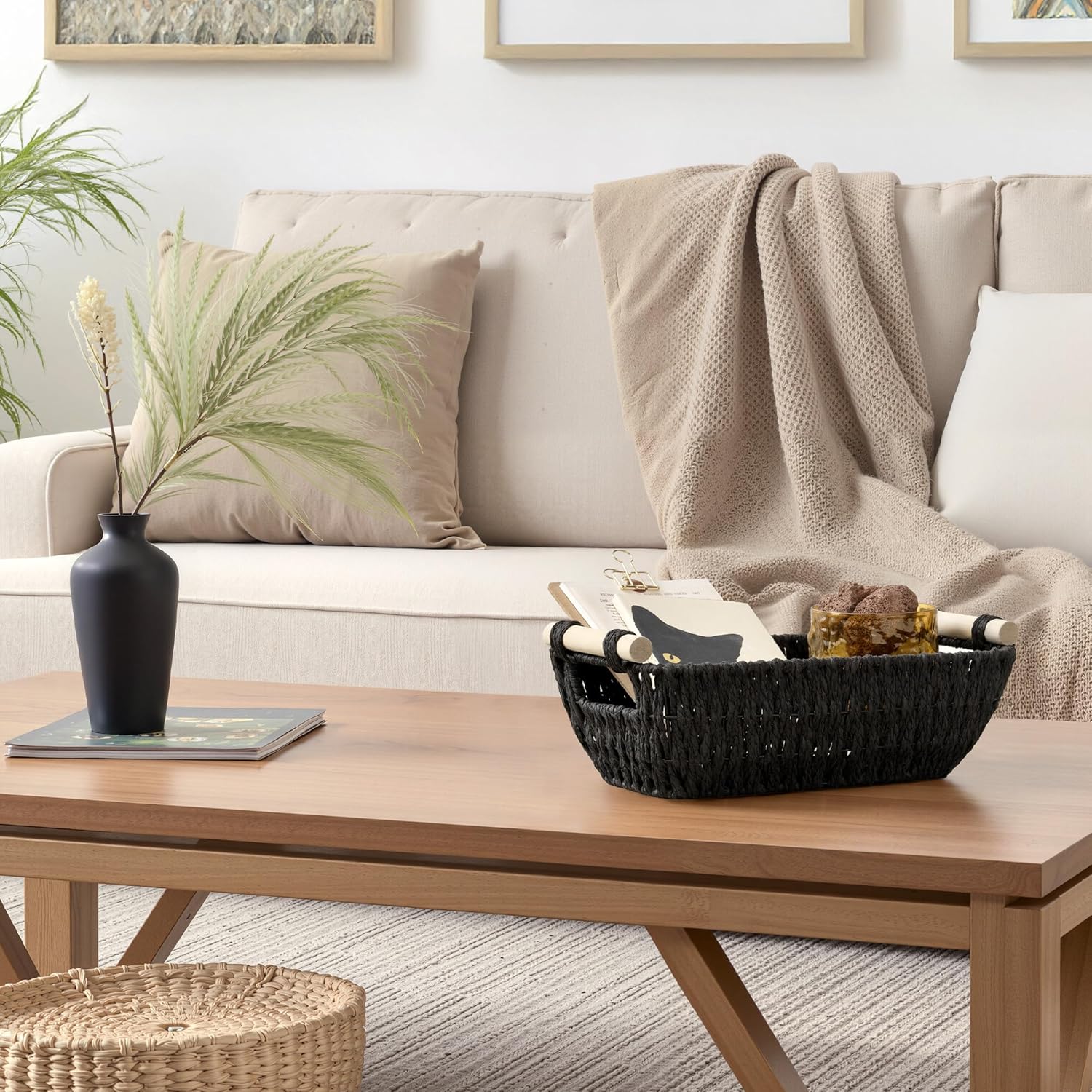 - Decorative Baskets: With its minimalist design, this woven basket adds warmth and style to any space. Ideal for the living room, bathroom, or bedroom, it keeps your items organized while enhancing your home’s aesthetic.