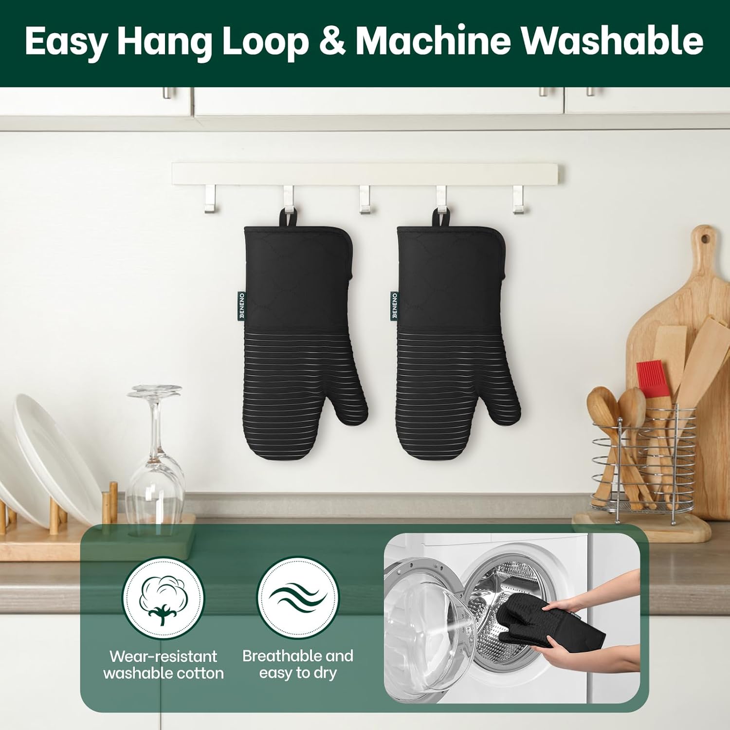 - Easy to Care & Easy to Store: Designed for busy kitchens, these oven mitts are completely machine washable to maintain freshness after long term cooking use, the built-in hanging loop provides instant organization, keep them within reach while adding a stylish touch to your kitchen decor