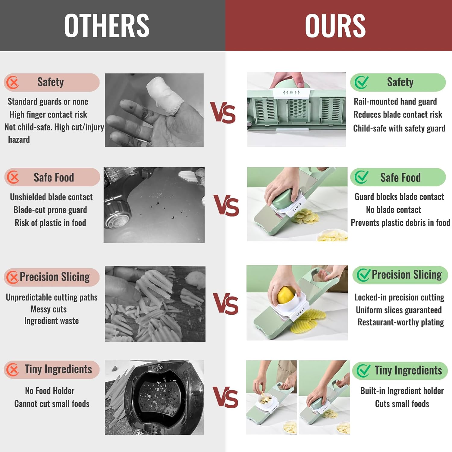 - Safe & Smart Hand Guard – Our sliding-track hand guard wraps securely around the slicer body, keeping veggies in place for straight, even cuts. Unlike loose guards that may shift and touch blades (risking plastic scraps in your food), this semi-fixed design stays safely anchored while slicing. Easily detach it when not needed