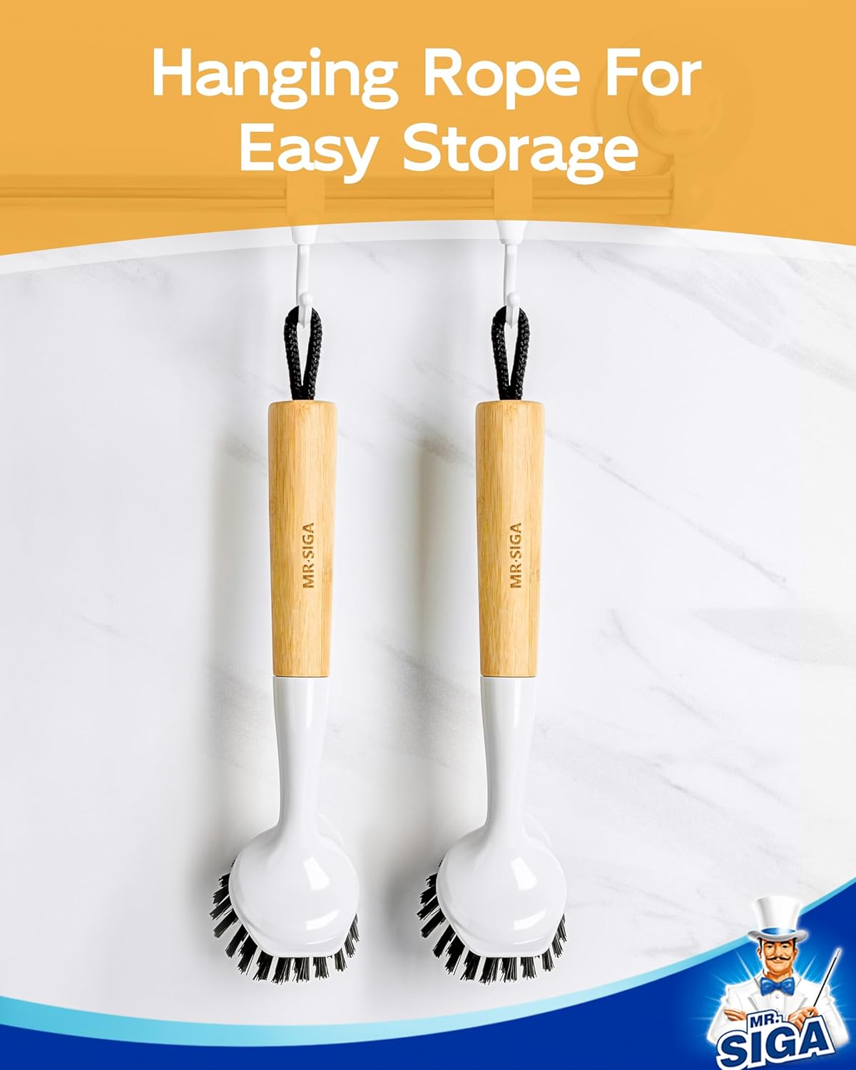 MR.SIGA Dish Brush with Handle, Dish Scrub Brush with Built-in Scraper, Bamboo Dish Brush for Pots and Pans, Kitchen Sink, 2 Pack