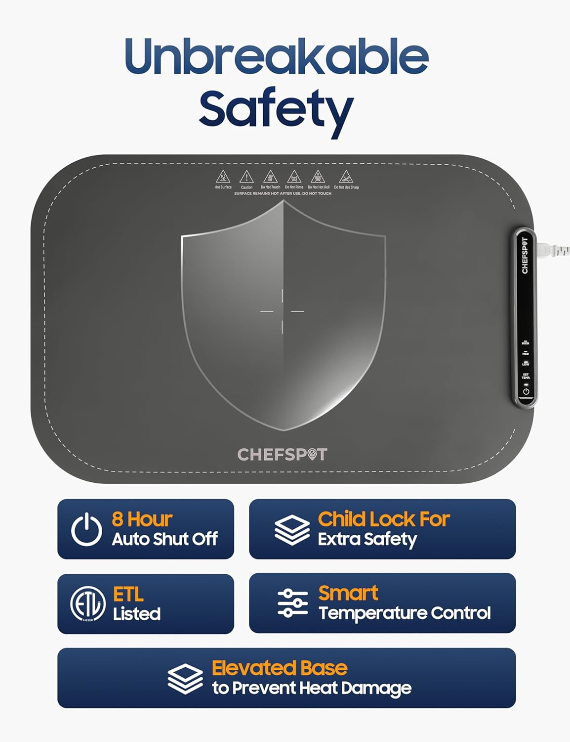 - Cleans in Seconds: Made with heat-resistant silicone, the surface is non-stick, waterproof, and easy to wipe clean. Say goodbye to messy fuel trays—this food warming mat keeps things simple, clean, and reusable.