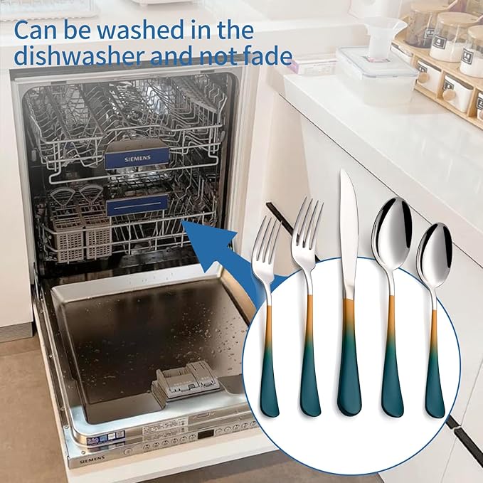 - 【Dishwasher-Safe】- The good quality colorful silverware set has the spray paint color that is very hard to wash off, simply rinse and place in the dishwasher ensures time-saving convenience when it comes to cleaning and keep sanitary, your proper care can make the utensil sets always looks as good as new, and enable the beauty cutlery to last for many years.