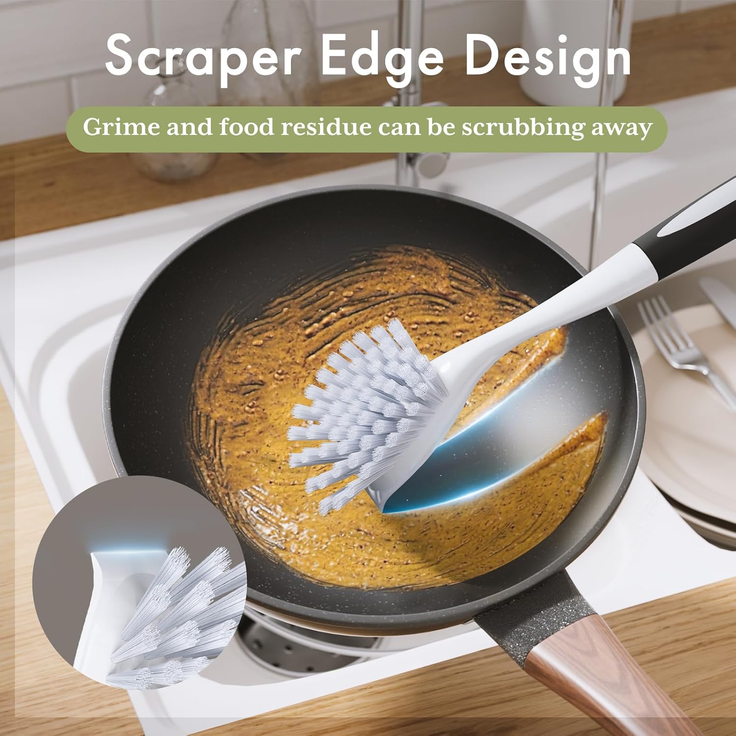 - Scraper edge design: Kitchen brushes have a handy scraper built onto the front that is quite sturdy and helpful, dish scrubber with scraper easily removes stuck-on food or tough stains on sink.