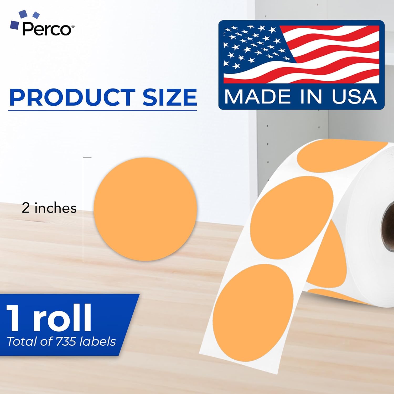 Perco Orange 2-Inch Perforated Circle Dot Thermal Sticker Labels — 735 Stickers/Roll, Direct Thermal Printer Compatible—with Permanent Adhesive for Organizing, Color Coding, Bin Labeling—Made in USA