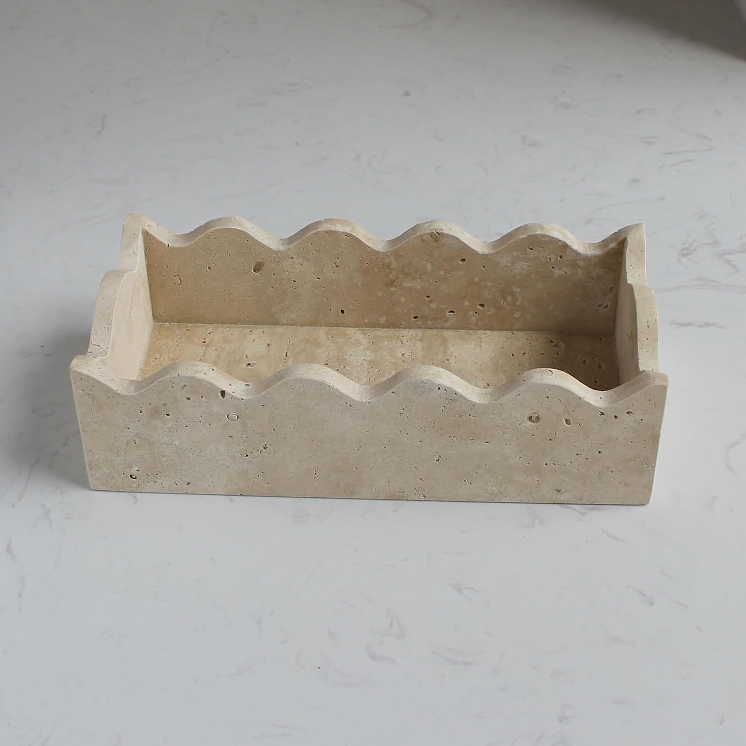 Natural Travertine Guest Towel Holder 9.8" × 4.9" for Bathroom, Rectangular Napkin Holder with Scalloped Edge, Tissue Hand Towel Tray for Dinner Table, Countertop Bathroom Vanity