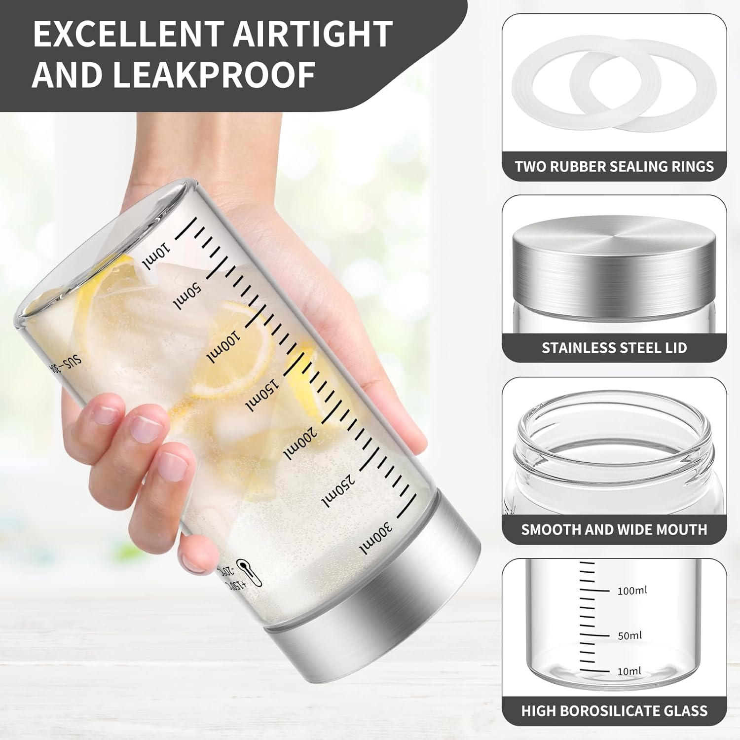 - 【Excellent Airtightness and Leakproofness】These glass bottles with lids are equipped with two silicone sealing rings, making them doubly airtight and leakproof for kitchen storage, and they won't leak even when the bottle is inverted. Note: Please regularly remove the sealing rings from the lids and thoroughly clean them to ensure the hygiene of the sealing rings