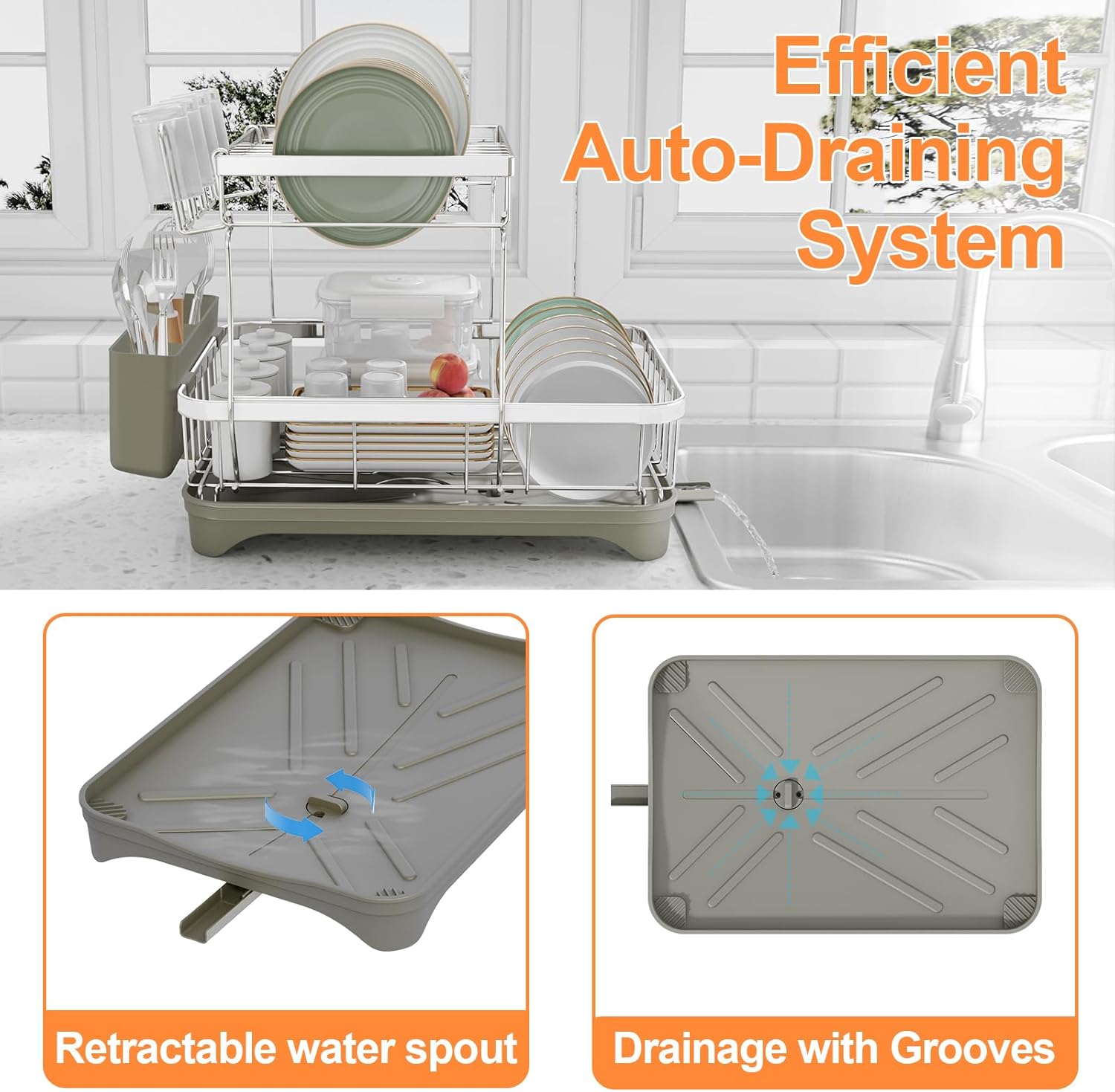 Dish Drying Rack, 2 -Tier 304 Stainless Steel Adjustable Spout Auto-Draining Dish Rack, Space Saving Dish Drainer with Drainboard and Utensil Holder for Kitchen Counter Grey