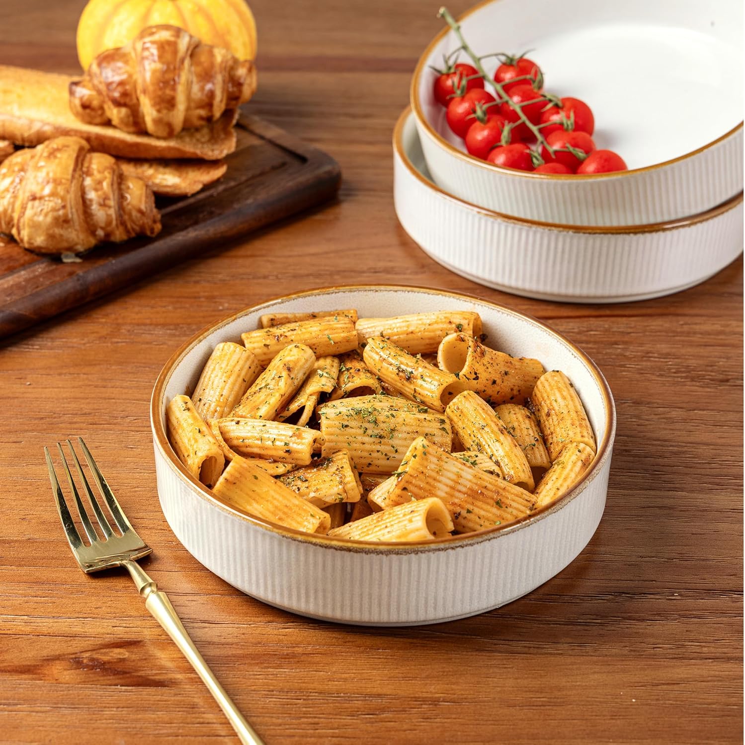 - Premium Stoneware Set of 6 Deep Pasta Bowls (7.5" Wide): Enjoy ample serving space with these perfectly sized 7.5-inch wide pasta bowls, The set includes 6 bowls.Perfectly designed not just for pasta, but also ideal for serving salads, fruits, oatmeal, cereal, soups, rice bowls, desserts, and more – from breakfast to dinner.