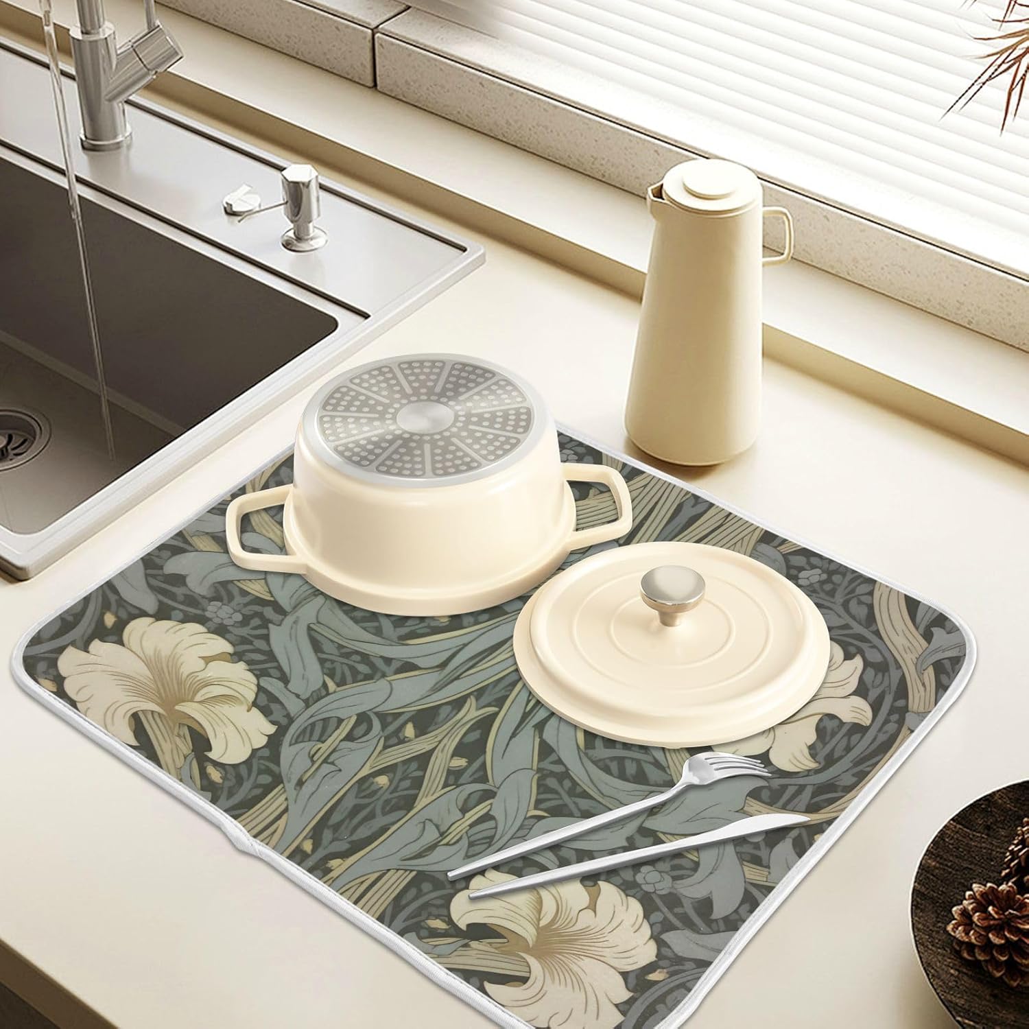 William Morris Flowers Print Dish Drying Mat for Kitchen Counter Absorbent Microfiber Small Drying Pad Dish mats for Kitchen Countertops 16 x 18 Inch