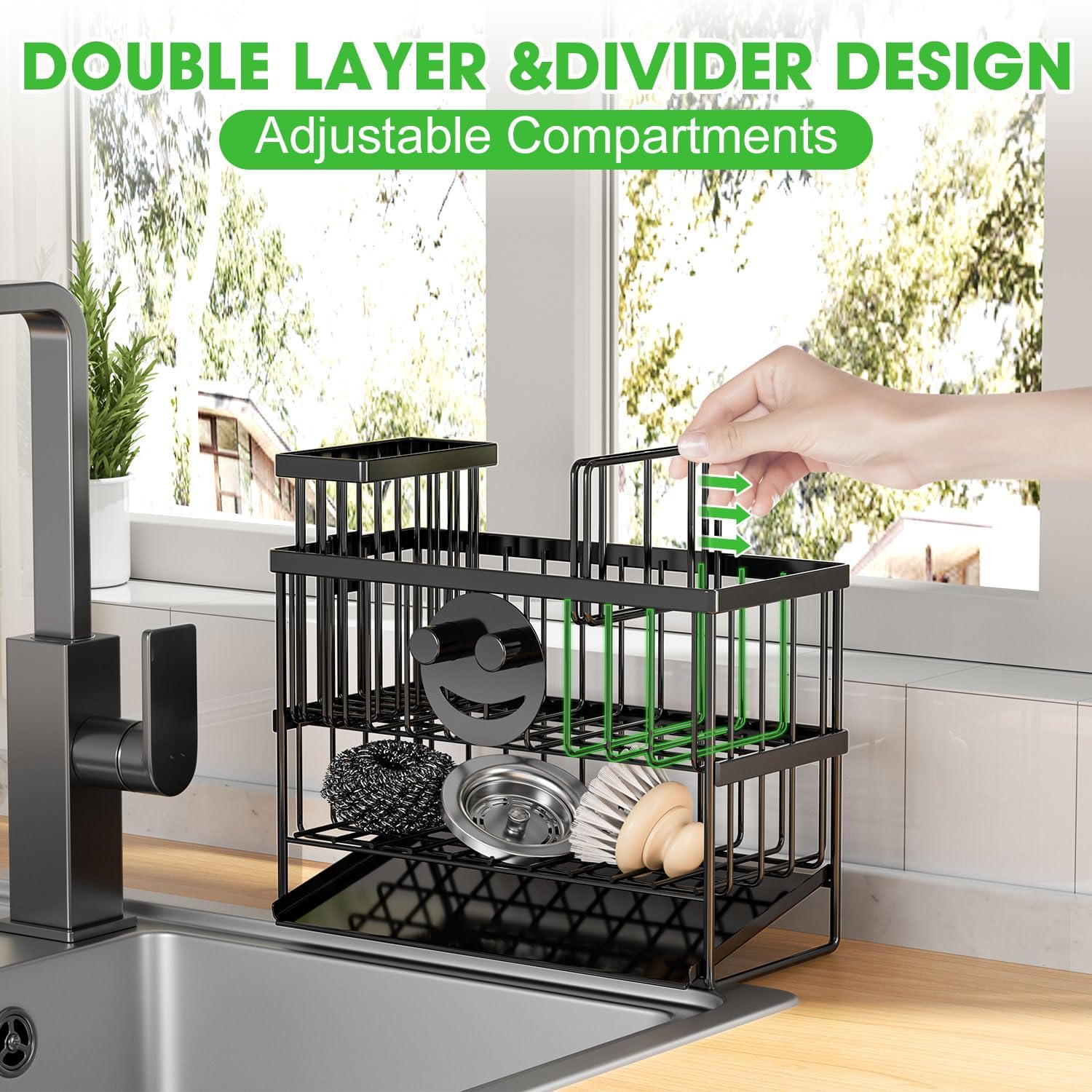 - 【Double Capacity】 The double-deck design makes the capacity bigger, can be used to store all kinds of hand sanitizers, sponges, dishwashing brushes, soaps and sink plugs, etc., space-saving, suitable for kitchens with limited space, make your kitchen countertop cleaner and neater.