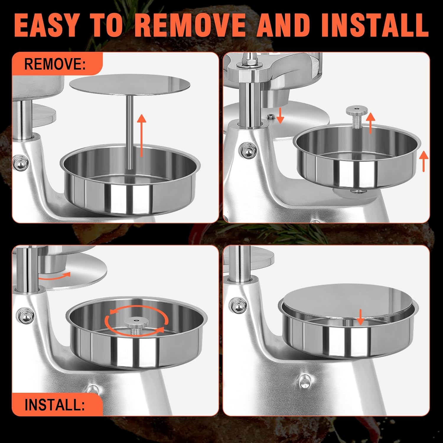 - 【High Quality Materials】 The tray of this burger patty press machine is made of food grade 304 stainless steel, and the body is made of aluminum-magnesium alloy with polished and oxidized surface.4 non-slip feet ensure stability during operation. The burger press is sturdy, corrosion-resistant, and easy to clean and maintain. The overall dimensions are 10.2 inches long, 6.1 inches wide and 10.6 inches high.