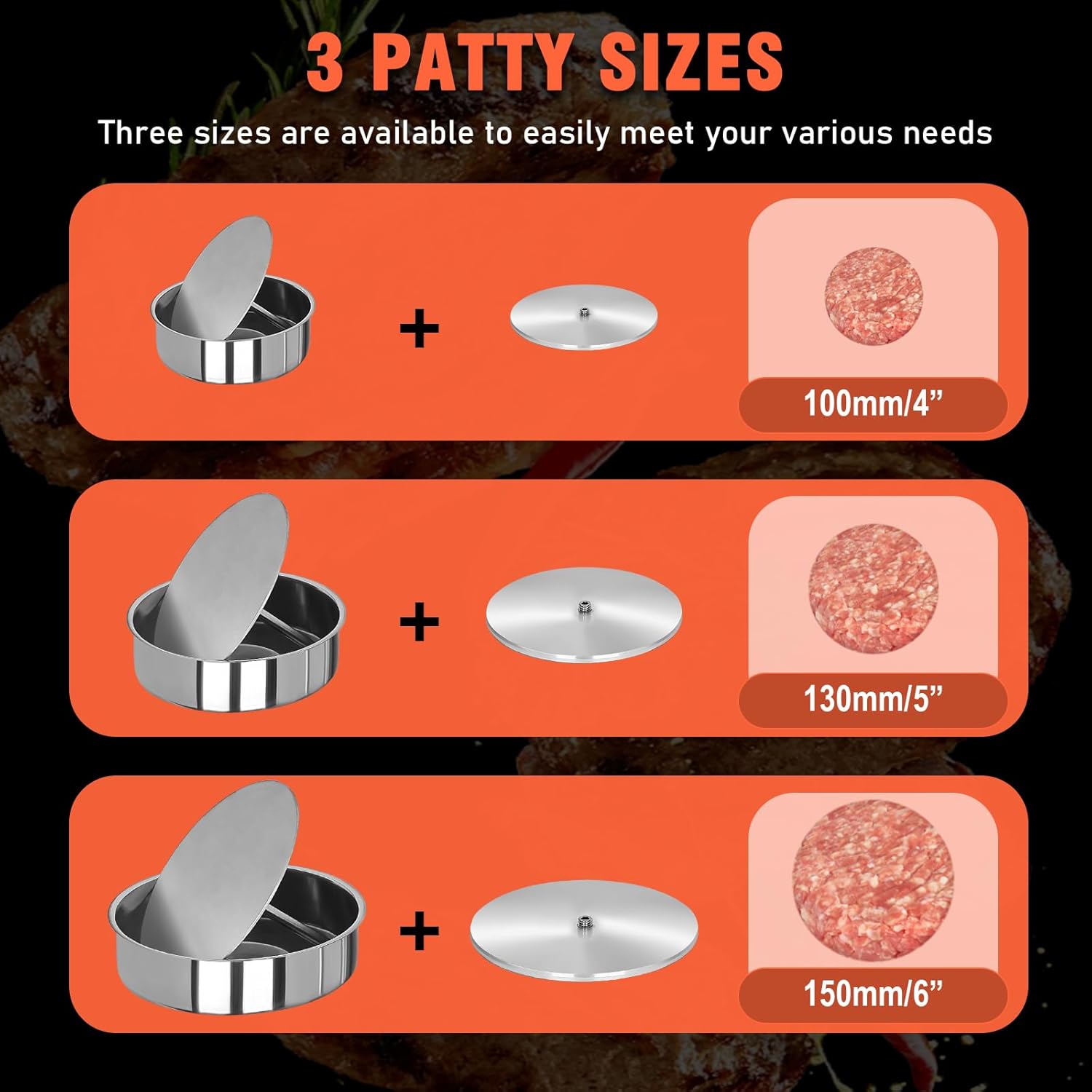 - 【3-in-1 Multifunctional Hamburger Patty Machine】 The burger patty press machine is equipped with three commonly used sizes of trays, which can make patties of 4 inches (100mm), 5 inches (13mm), and 6 inches (15mm) sizes, which can easily satisfy your multiple needs. And the tray is simple and easy to change, just rotate the tray to change.