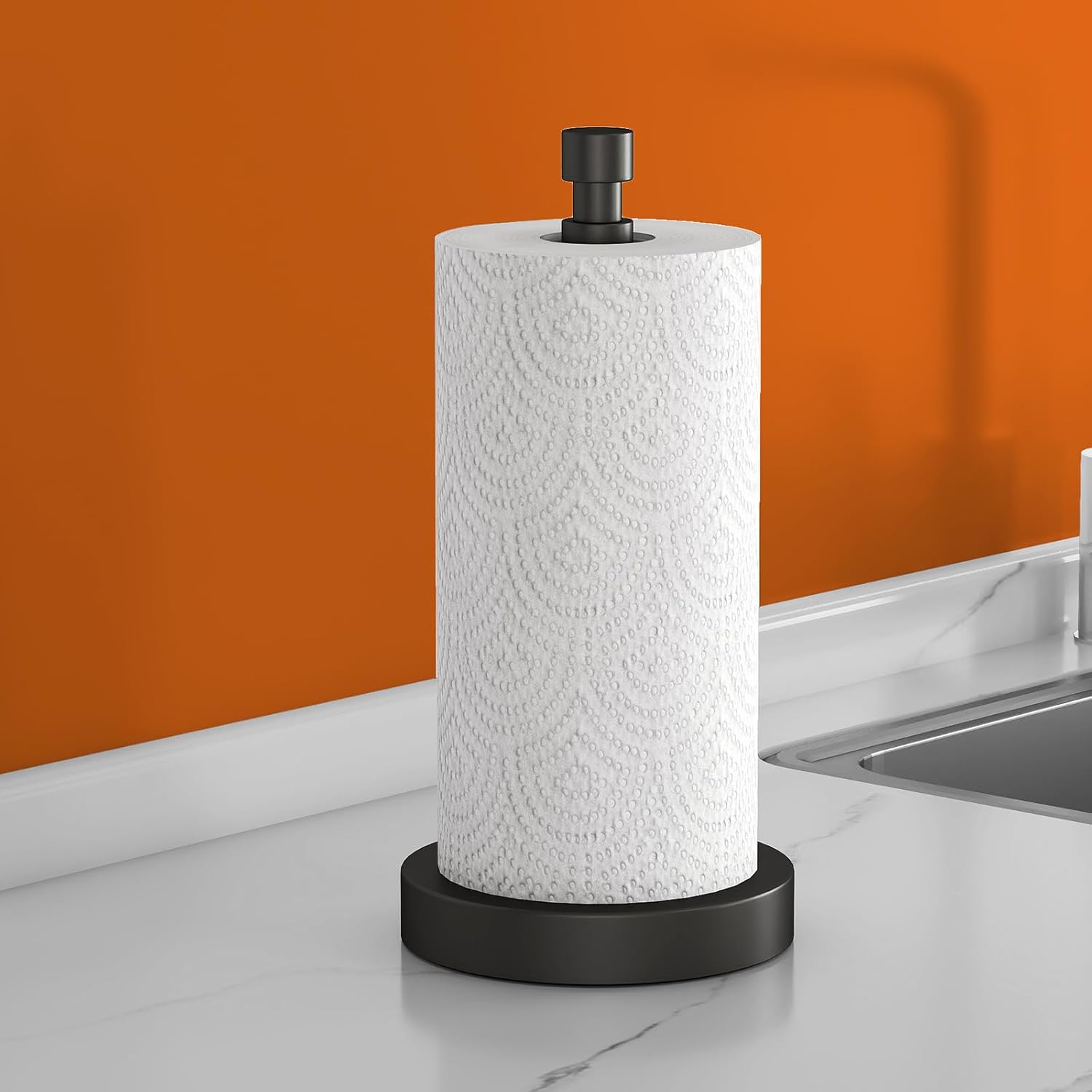 Paper Towel Holder Countertop, Black Paper Towel Holder with Weighted Base Non Slip, Standing Paper Towel Roll Holder for Kitchen Bathroom, Easy One-Handed Operation, Stainles Steel (Matte Black)