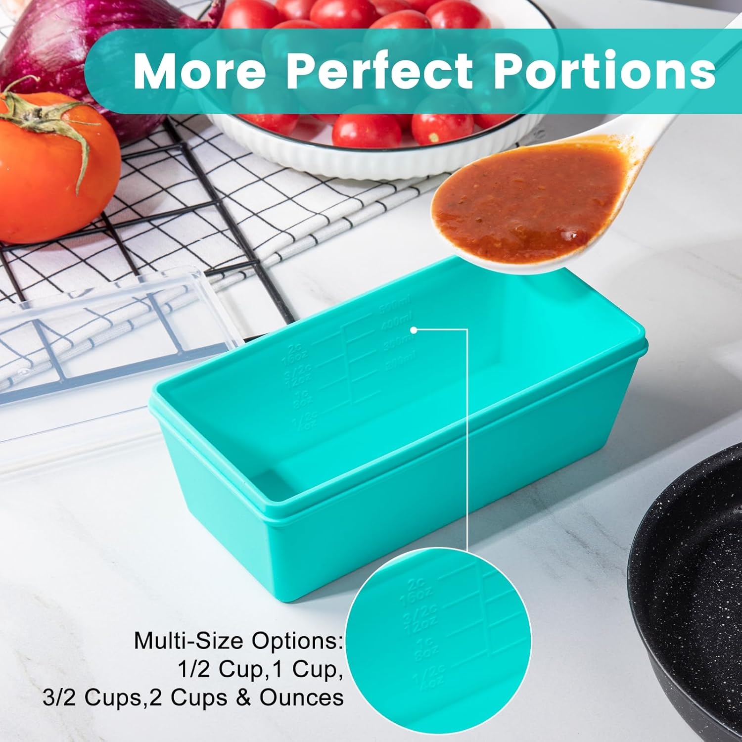 - Accurate Portion Control: Silicone freezer containers with measurement markings indicating capacities of 1-cup (250/125 mL, 8/4 oz) & 2-cup (500/250 mL, 16/8 oz), make portioning a breeze