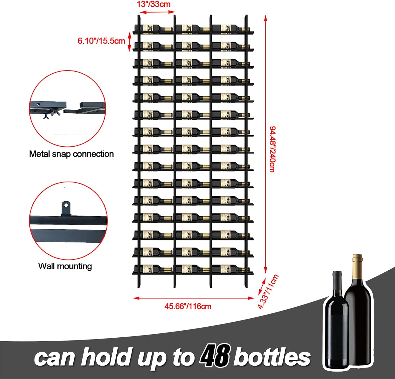 - Large Capacity: 94.48x74x4.33 inches, can hold up to 48 standard wine bottles; 94.48x45.66x4.33 inches, can hold up to 80 standard wine bottles, perfect for storing 750 ml standard wine or champagne.