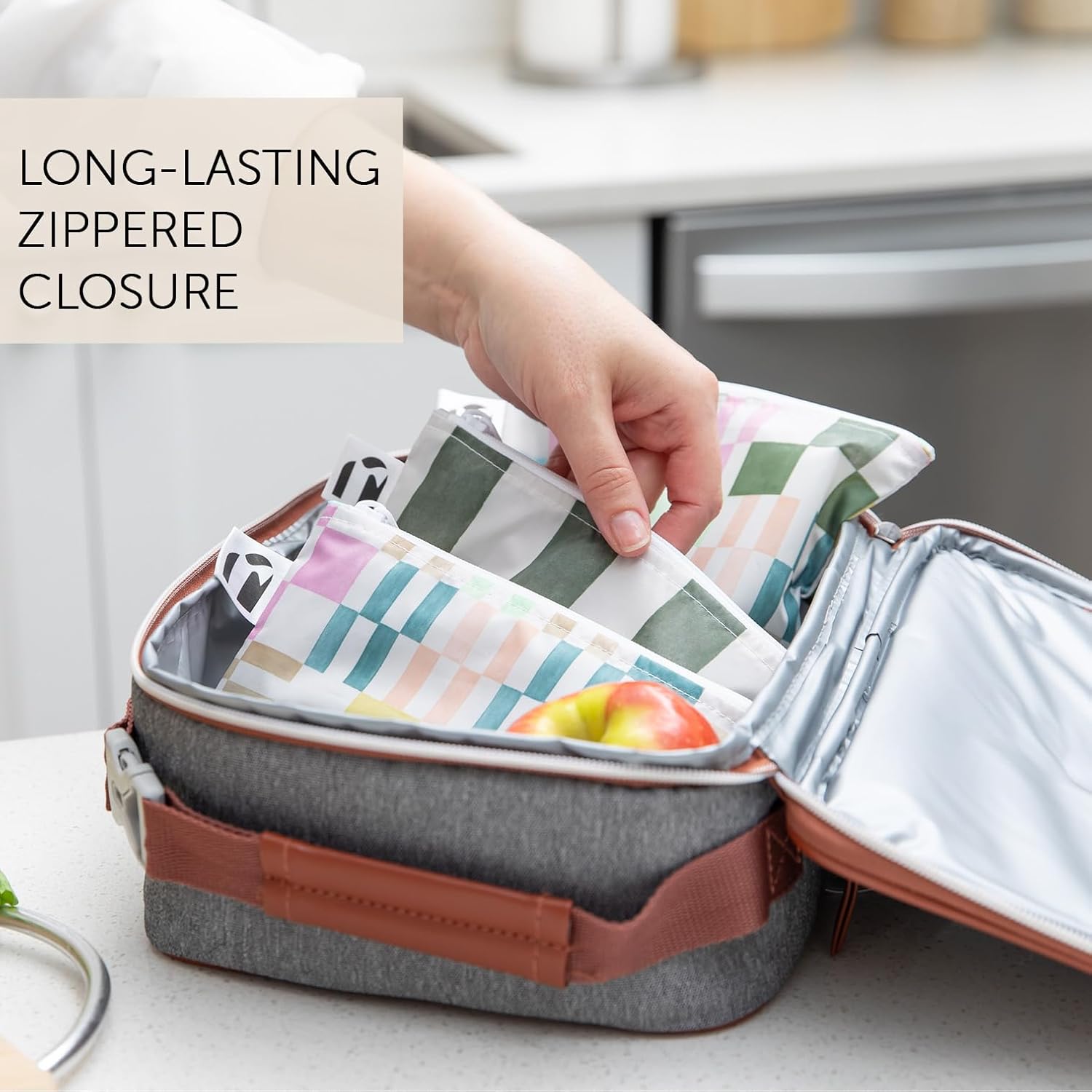 Roamio Reusable Sandwich and Snack Bags, for Kids School Lunch and for Adults Portion, Washable Fabric, Waterproof Cloth Zip Bag, Pack Travel Pouch, Food-Safe, 4-pack Set Green Stripe and Multi Check