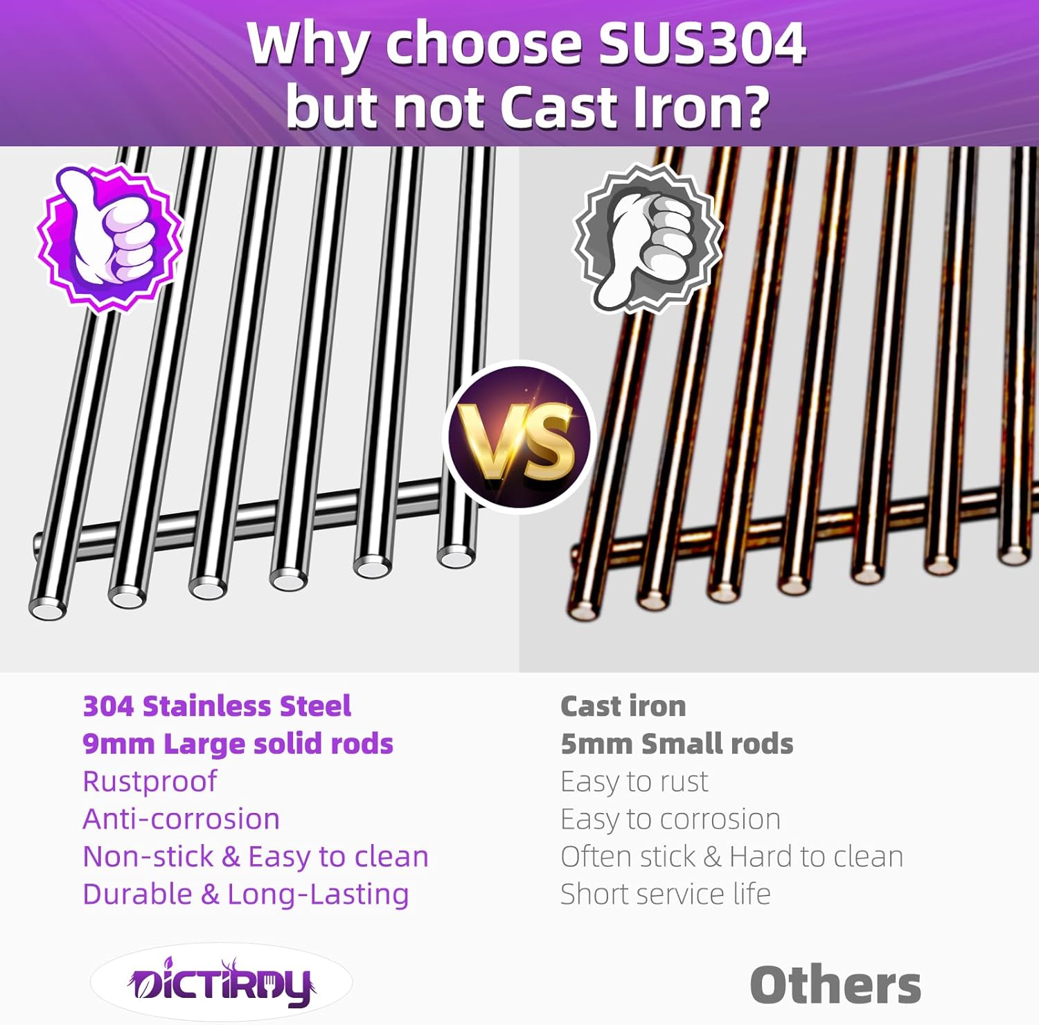 - 【9MM Diameter Solid Rods】Thickness of Dictirdy cooking grate is 9MM, more thicker and stronger than other 5mm/ 7mm grill grates. Our barbecue cooking grates feature SUS304 thicken solid rod bars, which are not easy to deform and more durable for long time using.