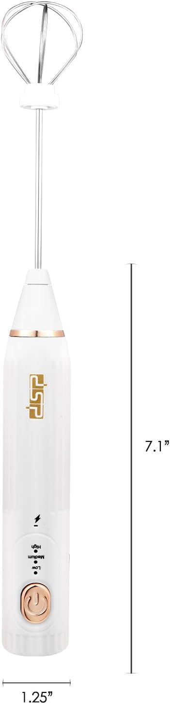 - 【Rechargeable 3-Speed Frother】DSP handheld milk frother features a Powerful battery with USB charging (DC5.5V). With 5800/8500/12000 RPM speeds, it creates café-quality foam for coffee, latte, or hot chocolate in 15 sec. Includes 2 stainless steel whisks for drinks & baking.