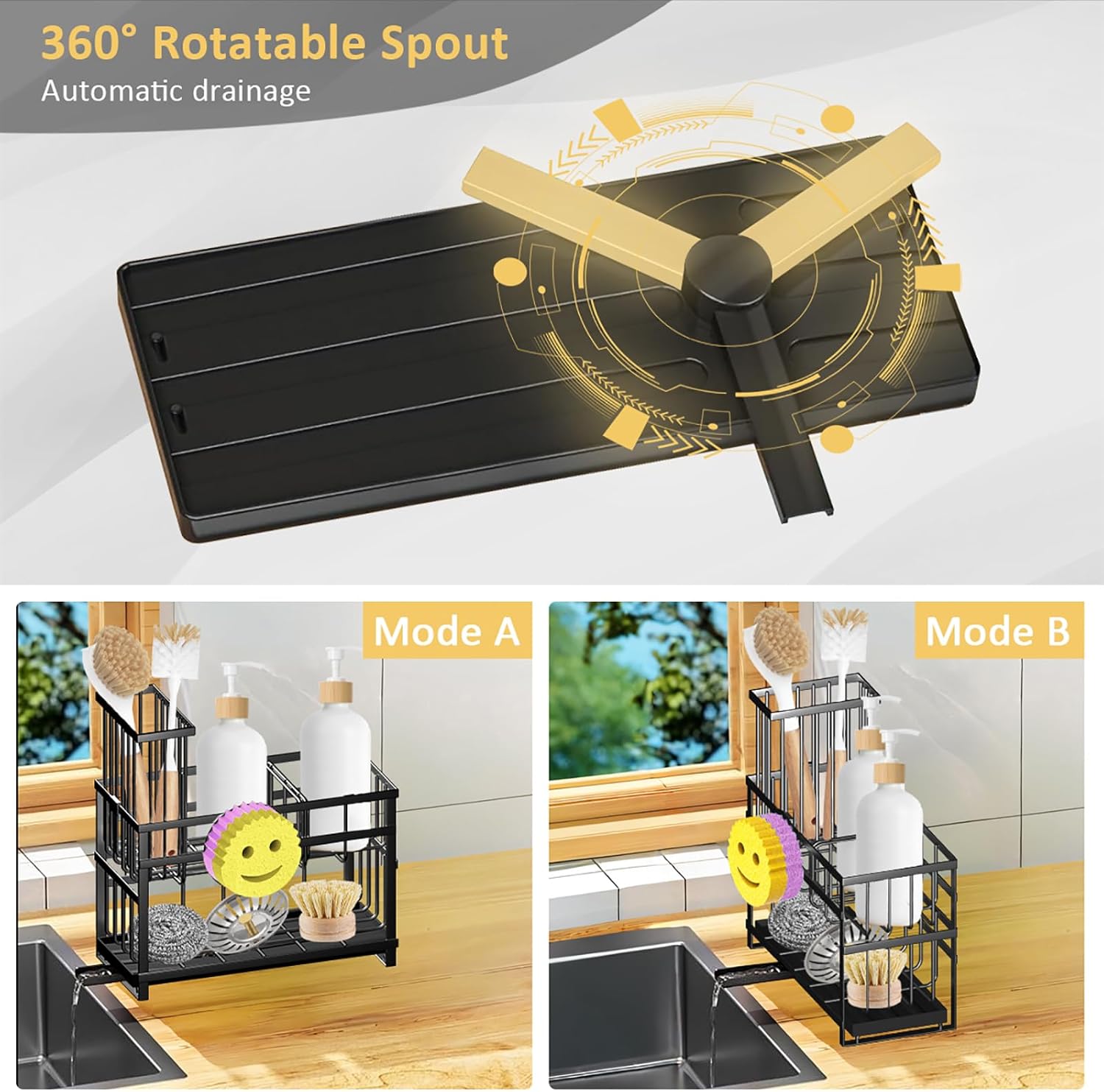 - 【Rotatable Spout】This kitchen sink caddy features a rotatable spout that swivels in three directions, ensuring that water from the sink sponge holder is directed straight to the sink. This design helps maintain a dry countertop, cutting down on the need to clean the drip tray frequently—ideal for enhancing your kitchen organization and saving your cleaning time.
