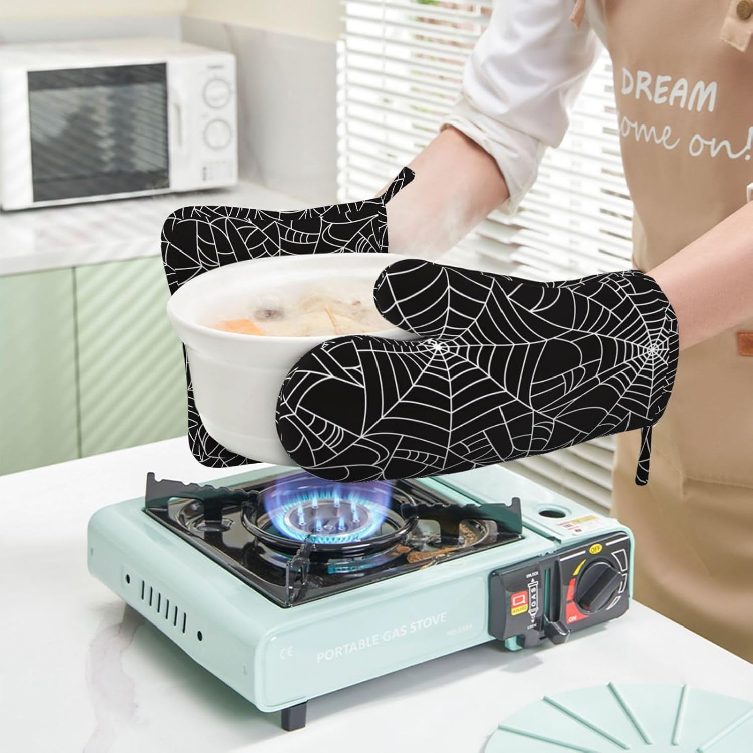 - NON-SLIP GRIP: The spiderwebs oven mitts feature a textured, non-slip surface that enhances your grip and control when handling hot items. This provides you with a secure hold, reducing the risk of accidental slips or drops while transferring dishes from the oven or stovetop
