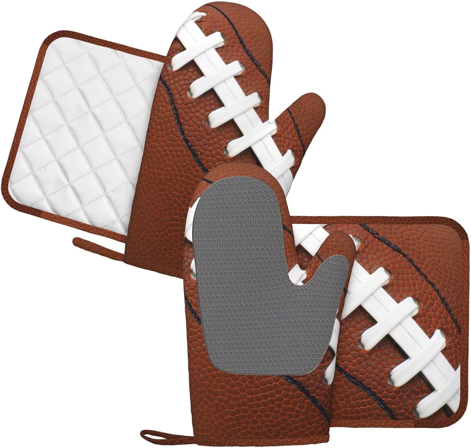 American Football Oven Mitts and Pot Holders Set of 4 Silicone Rugby Leather Lace Fun Traditional Sport Ball Kitchen Mitten Gloves and Potholders Set Heat Resistant Oven Gloves Hot Holders
