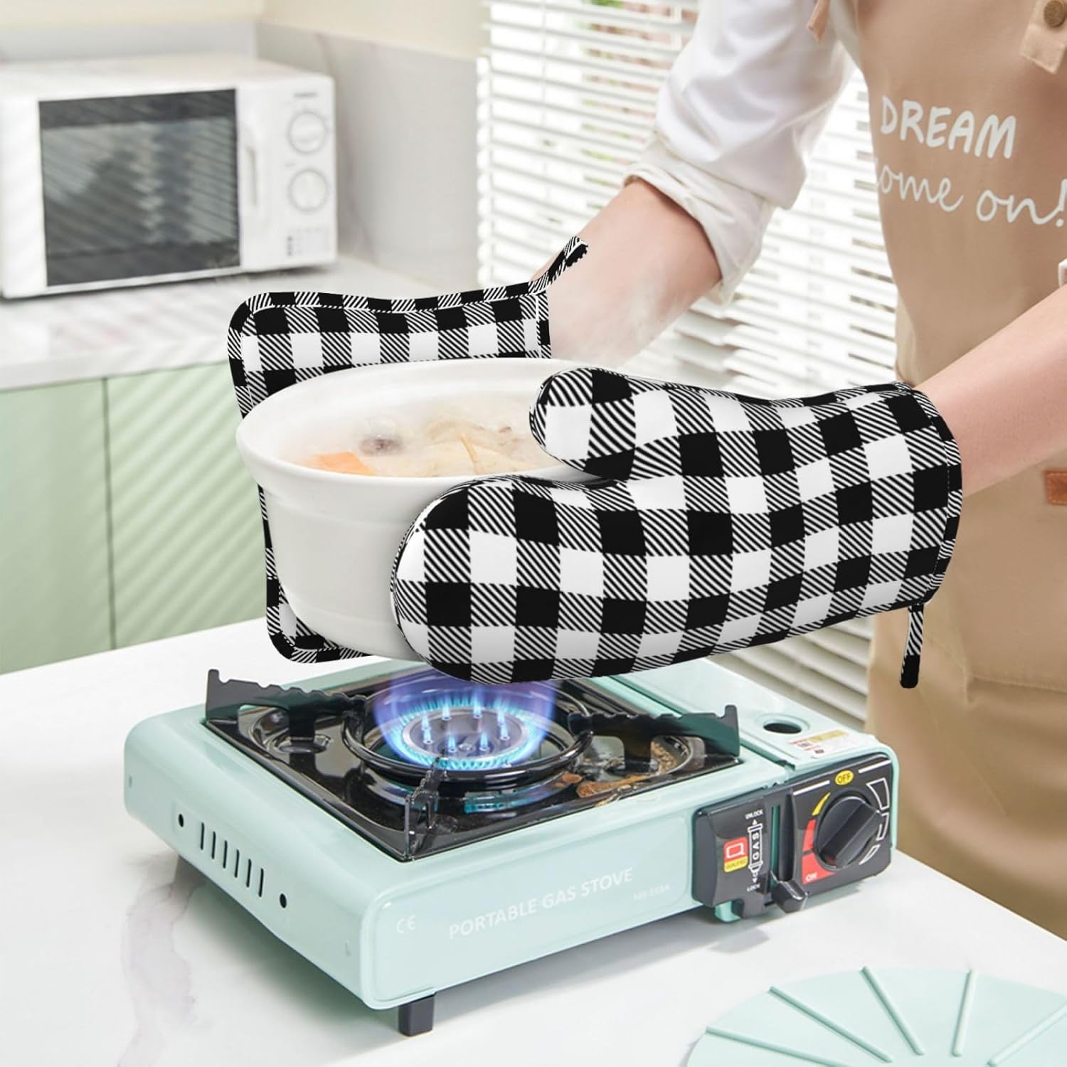 - NON-SLIP GRIP: The gingham plaid check black oven mitts feature a textured, non-slip surface that enhances your grip and control when handling hot items. This provides you with a secure hold, reducing the risk of accidental slips or drops while transferring dishes from the oven or stovetop