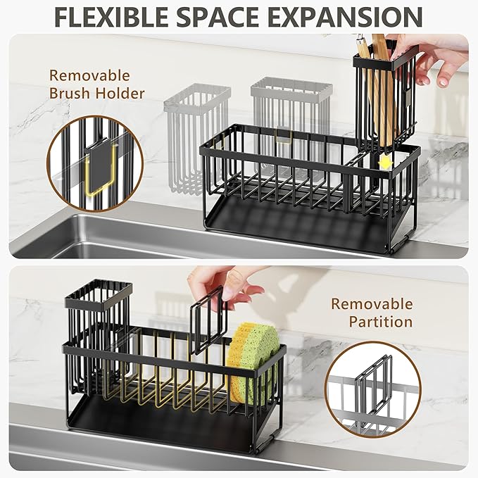 - 【Beveled Drain】This kitchen sink organizer features a sloped stainless steel drain plate, allowing sponge water to drain directly into the sink. No water remains on the countertop, and you don't need to constantly pull out the drip tray to clean it, saving you time.