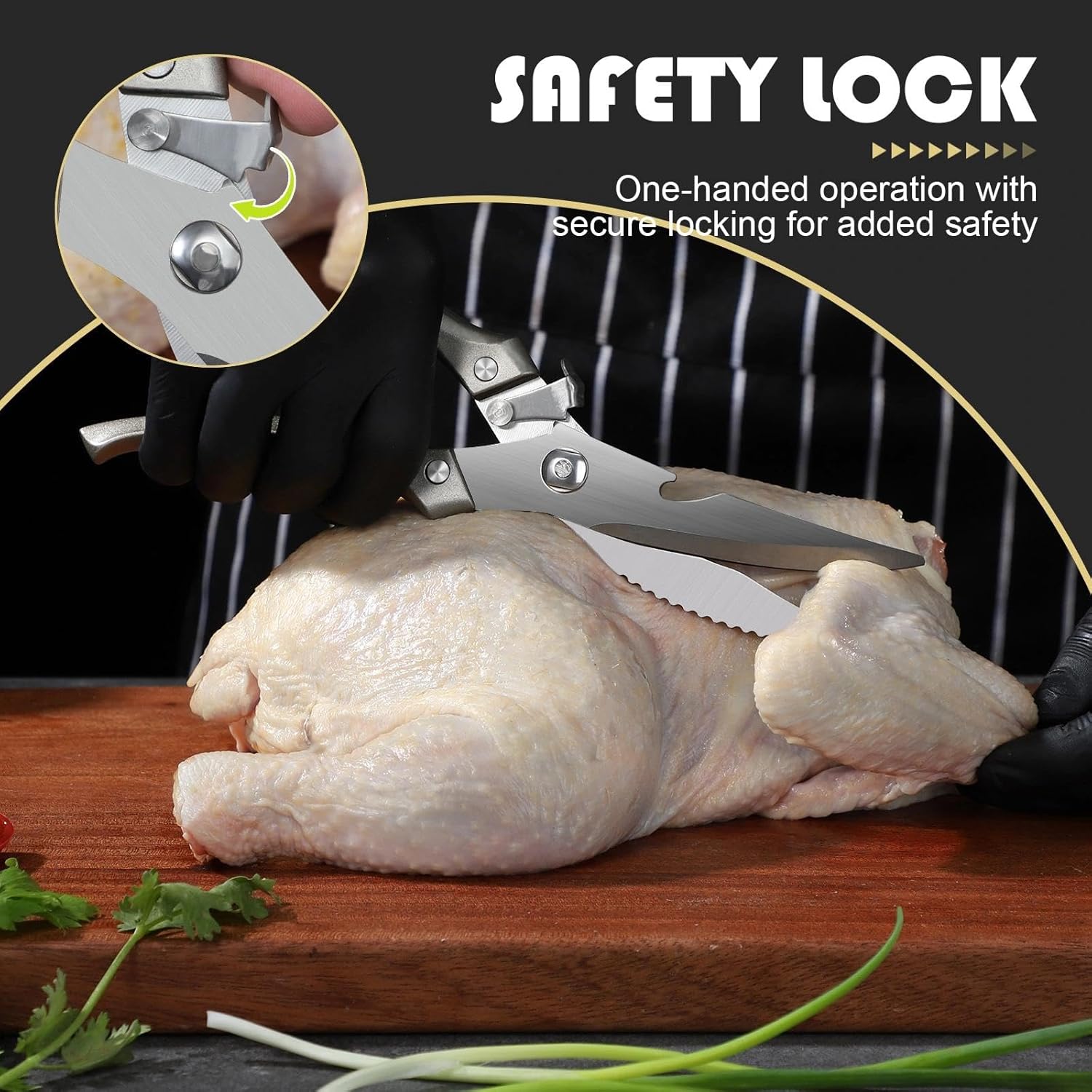 - 【Excellent quality】 The kitchen shears set crafted from high-chromium stainless steel offer razor-sharp cutting power and exceptional durability. The poultry shears upgraded 3.5mm thickened blades are engineered to cut through poultry bones, fish fin, or tough meat tendons with ease.The precision kitchen shears upgraded with a 15° cutting angle, ensure clean, smooth cuts—perfect for herbs, baking paper, and packaging without tearing.