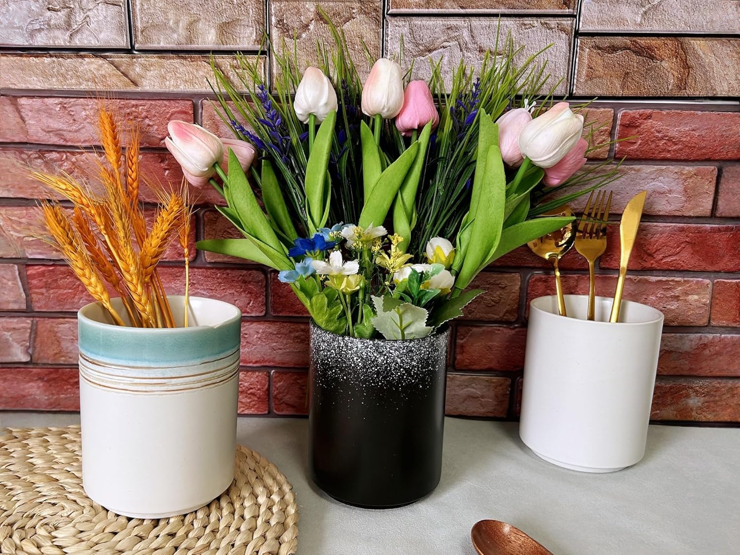- đ ăWonderful Kitchen Decoră: The kitchen utensil holder for kitchen counter has gradient colors with retro style. The color design of ceramic utensil holder for kitchen counter imitates natural landscapes. The vintage cooking utensil holder is perfect addition and decoration to your kitchen counter, coffee bar and dinning room of your home.