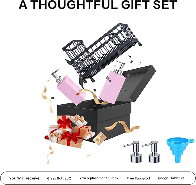 - Stainless Steel Sponge Holder + Pink Glass Bottle + Stainless Steel Rust-Proof Pump