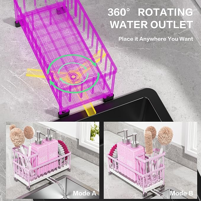 - ROTATABLE SPOUT:This kitchen sink caddy comes with a rotatable spout that swivels in three directions so that the water in the sponge can be directed to the sink. There won't be any water left on the countertop, you don't need to pull out the drip tray to clean it often, saving your cleaning time.