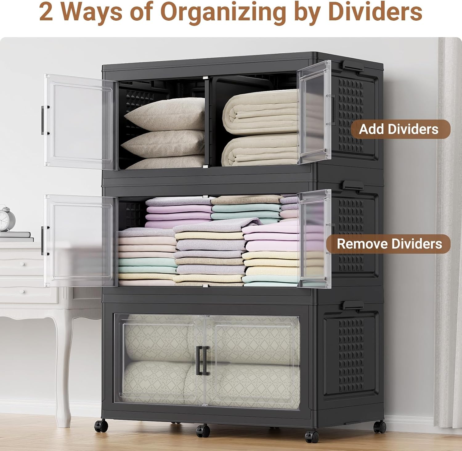 - 【Two Opening Ways & Clear Magnetic Door】Our BROVIEW V40 plastic collapsible stackable storage box can be opened in two ways: You can open the top cover or the magnetic door from the front. Both ways can easily access larger items such as clothes and blankets. The front cover of each storage bin is transparent for a beautiful display and easy to see what you want. (One Lid, One Set)