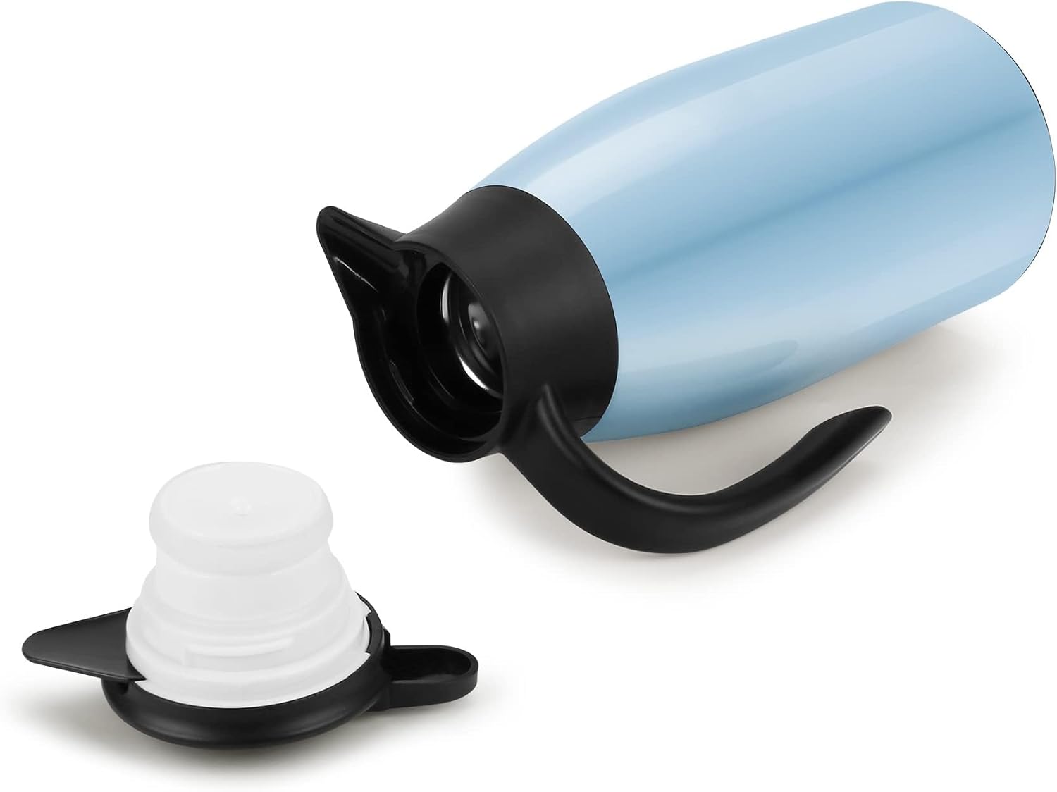 - SINGLE HAND POURING, USER FRIENDLY: To pour water, simply press the button, release the button to close it again. It's safe to touch the coffee flask exterior body either it is a hot or cold beverage inside, as the temperature is locked in and the carafe body stays cool.