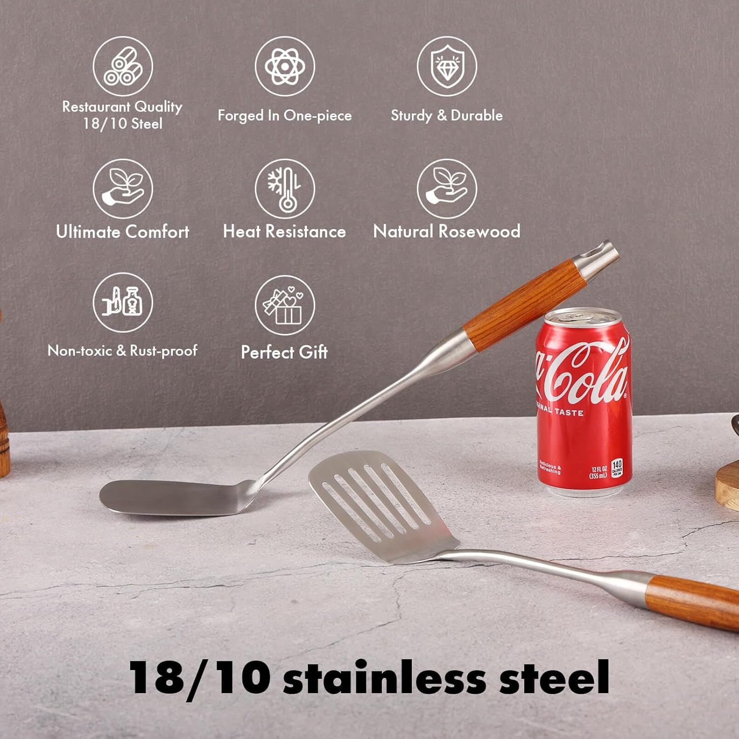 - 【15.2inch Slotted Turner & Solid Turner】: Not too heavy and not too light, ergonomic design, precise balance, silky to the touch. The unique grain of the natural rosewood handle is exceptionally beautiful, silky to the touch, provide excellent grip and high heat resistance, ensuring that the chef's hands stay cool, keep you entertained during the long hours of cooking, it can greatly enhance the cooking experience