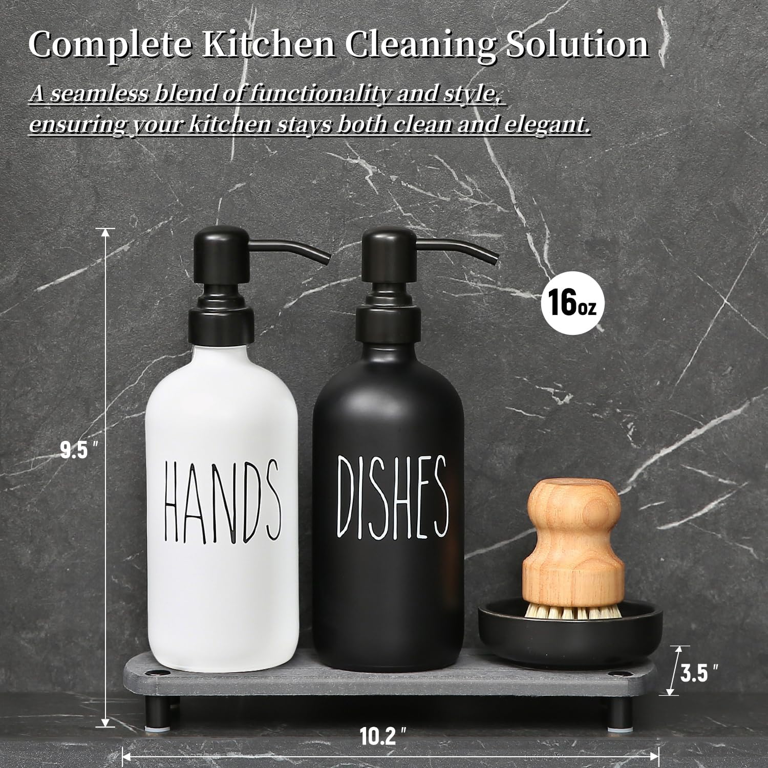 - [Complete Kitchen Cleaning Solution] This set includes one dish soap bottle, one hand soap bottle, a kitchen dish brush, and a ceramic brush holder, all neatly arranged on a stone drying tray.