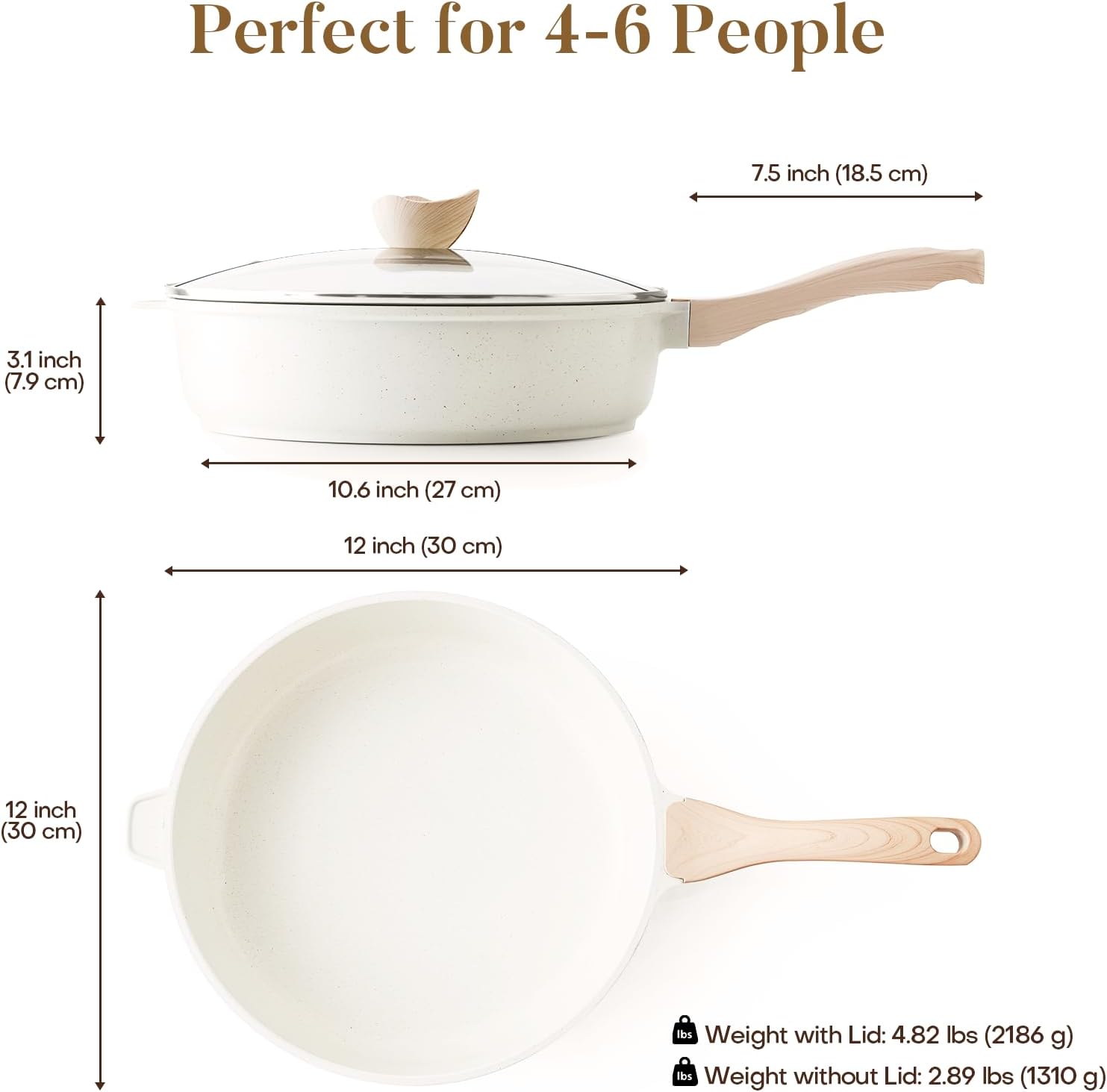 - 【Versatile Saute Pan with Lid】: Experience the convenience of our 12" diameter, 3.2" height, and 5 quarts capacity ceramic cookware; this large and deep skillet, also functioning as a deep frying pan and induction frying pan, is perfect for stir-frying, frying, boiling and deep-frying a variety of dishes with ease
