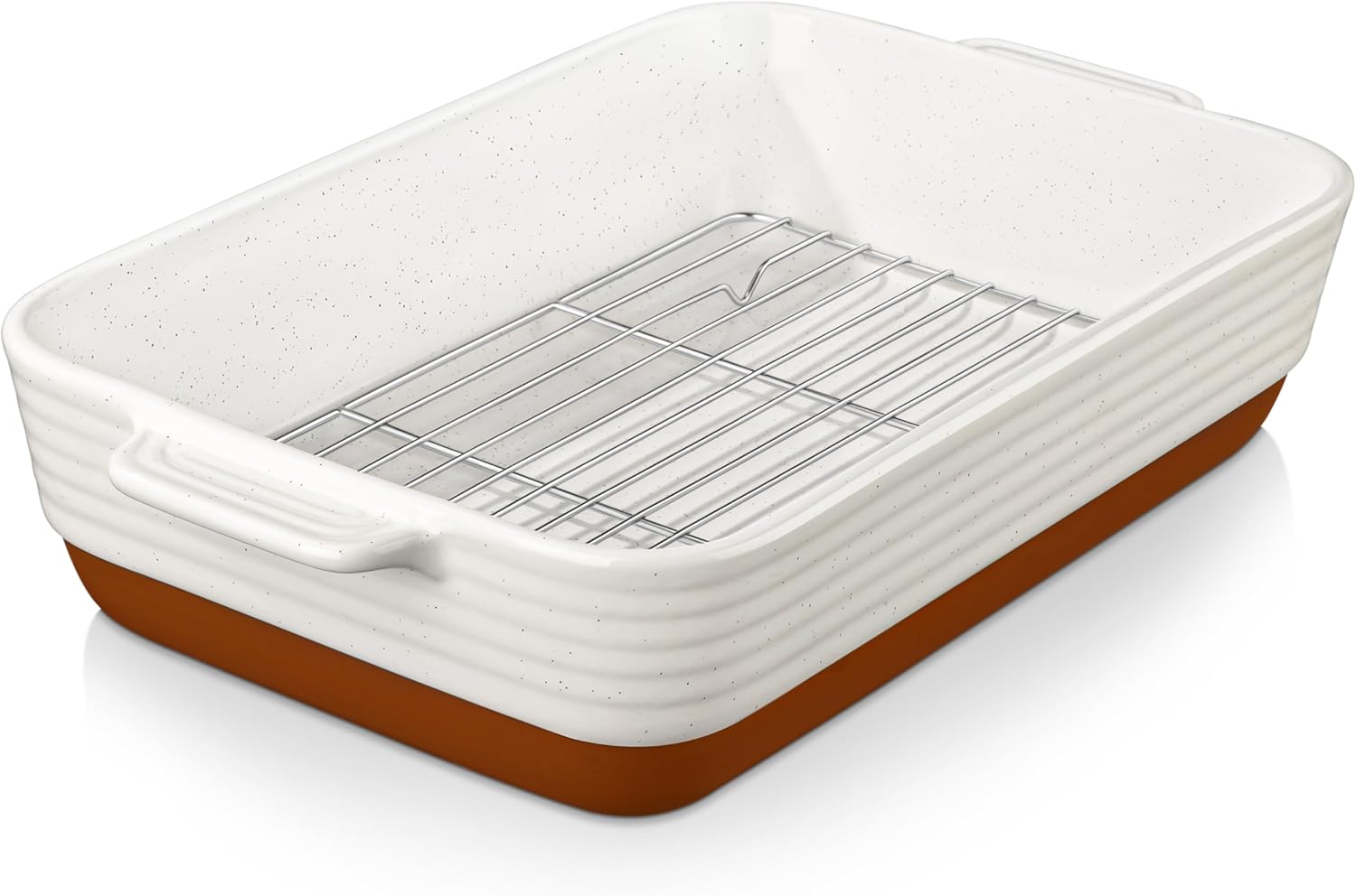 - 【2-in-1 Design with Removable Rack】This ceramic baking dish comes with a stainless steel drip rack, perfect for roasting meats evenly while keeping them out of excess grease. Easily remove the rack to use it as a casserole or lasagna pan