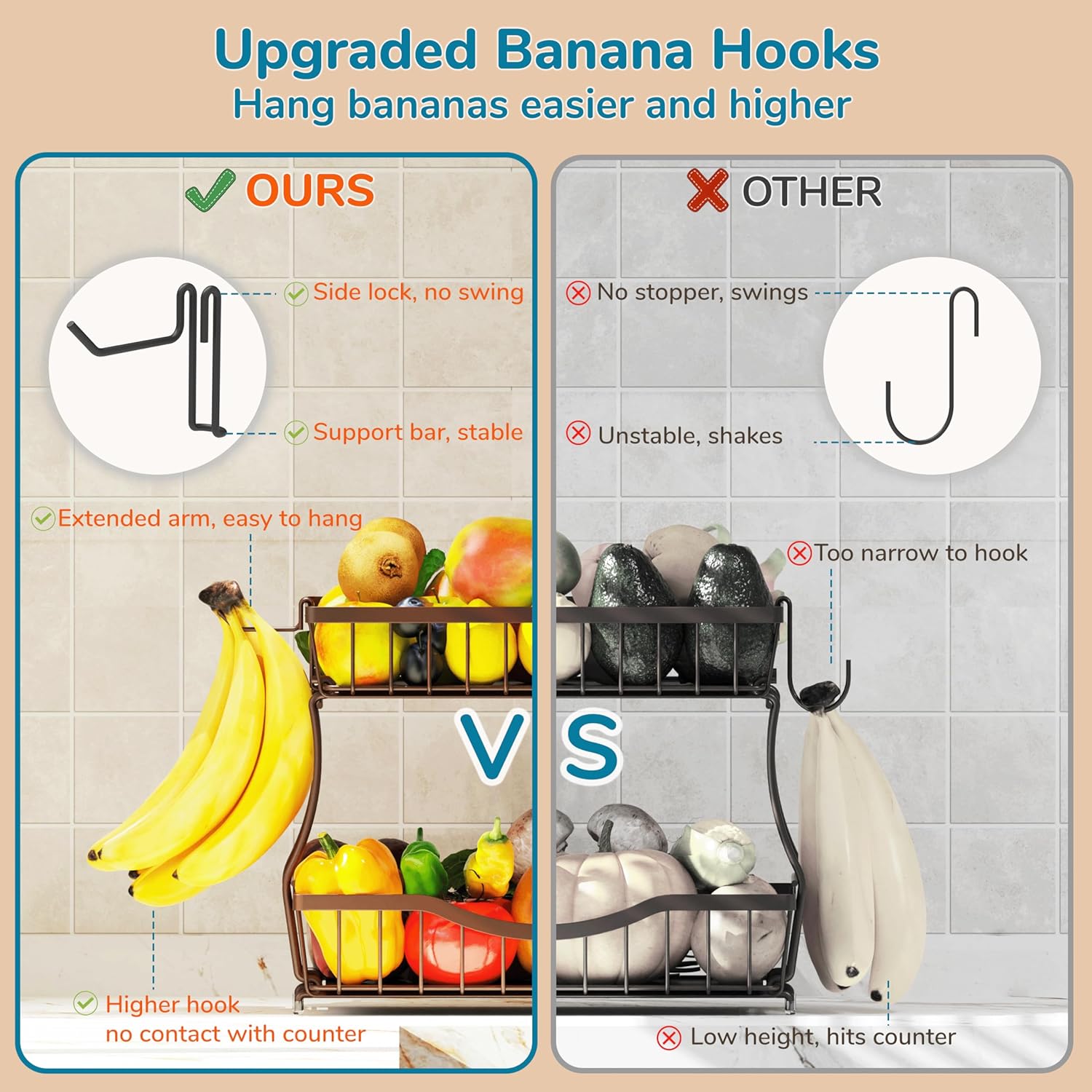 Large 2-Tier Fruit Basket for Kitchen Counter with 2 Banana Hangers – Metal Fruit Bowl for Onion, Vegetable, Snacks, Breads Storage – Countertop Organizer – Bronze