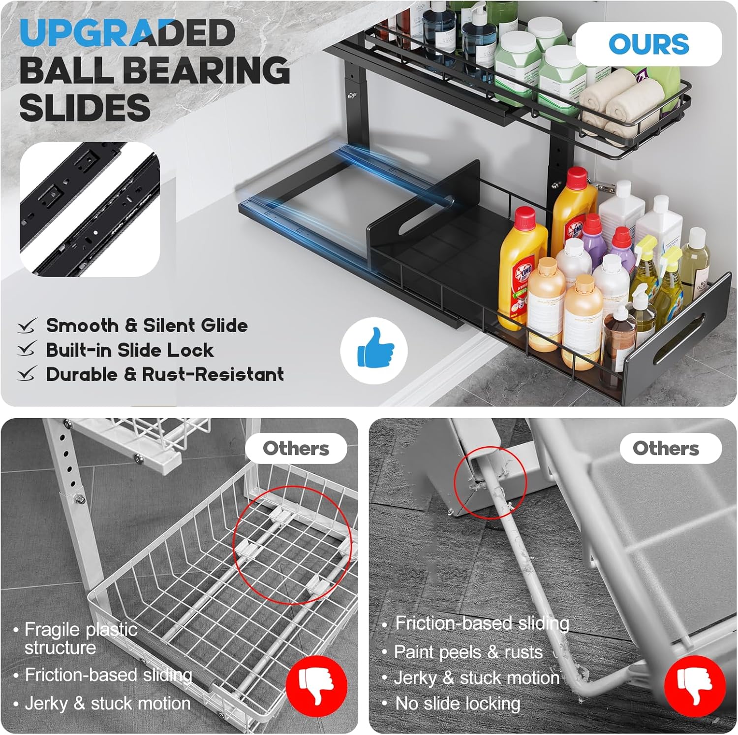2 Pack 18 IN Depth Under Sink Organizer with Smooth Ball Bearing Slides,2-Tier Pull Out Cabinet Storage,Slide Out Drawers for Bathroom&Kitchen,Rust-resistant Coating,Height Adjustable-Black