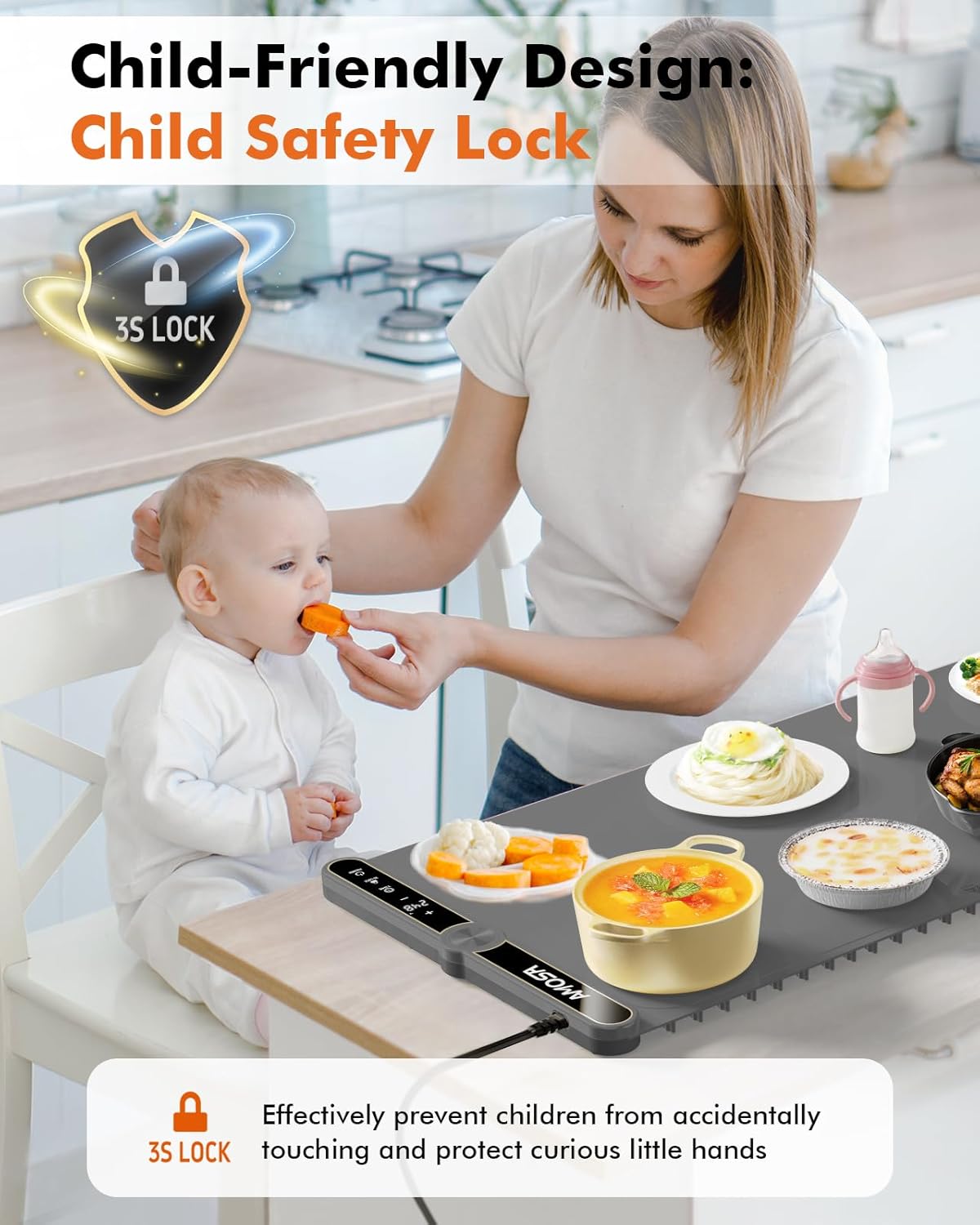 - 【Multiple Safety Protections】Different from other ordinary warming trays, our heating plate has multiple safety protection functions. It will automatically power off after working continuously for 18 hours to prevent accidents. The child protection lock design ensures the safety of your children and reduces accidental injuries caused by accidental touch. The warming pad also has a built-in Over-Temperature Protection to prevent excessive temperature and damage to personnel or machines. In addition, we also thoughtfully give you an extra placemat, which can be placed on your desktop to protect your beloved dining table from being damaged.
