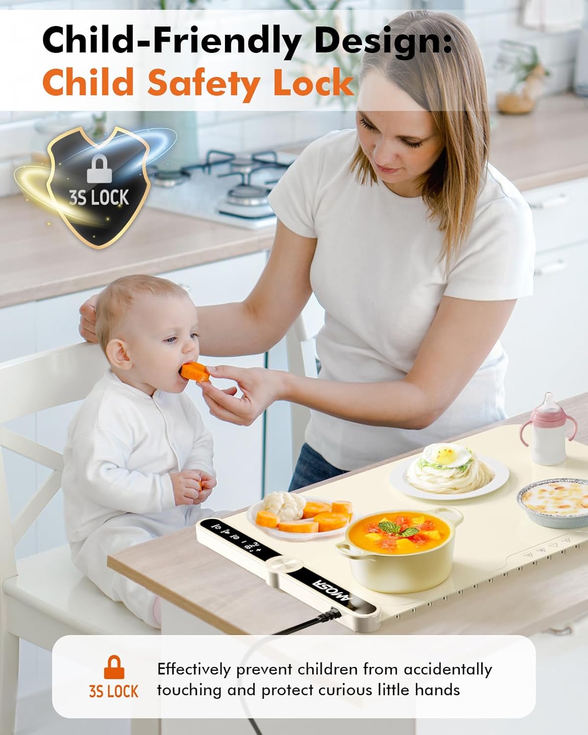 - 【Multiple Safety Protections】Different from other ordinary warming trays, our heating plate has multiple safety protection functions. It will automatically power off after working continuously for 18 hours to prevent accidents. The child protection lock design ensures the safety of your children and reduces accidental injuries caused by accidental touch. The warming pad also has a built-in Over-Temperature Protection to prevent excessive temperature and damage to personnel or machines. In addition, we also thoughtfully give you an extra placemat, which can be placed on your desktop to protect your beloved dining table from being damaged.