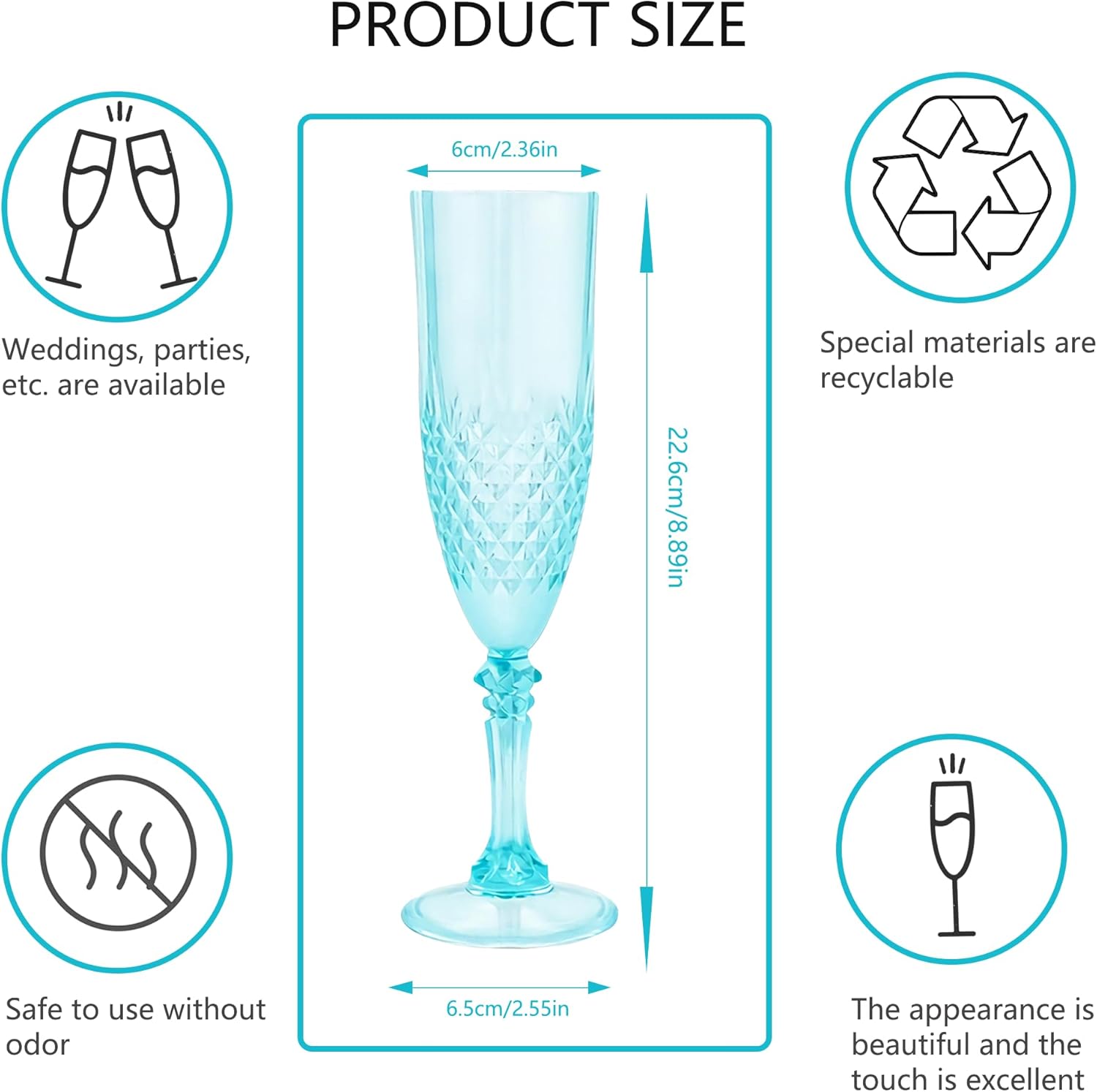 - Charming Set: Champagne flutes set include 12 retro-style light cyan blue champagne plastic wine glasses, providing ample quantity to meet your daily use and replacement needs. A suitable champagne cup is the icing on the cake. Plastic wine glasses not only carry the wine, but also carries the laughter and blessings
