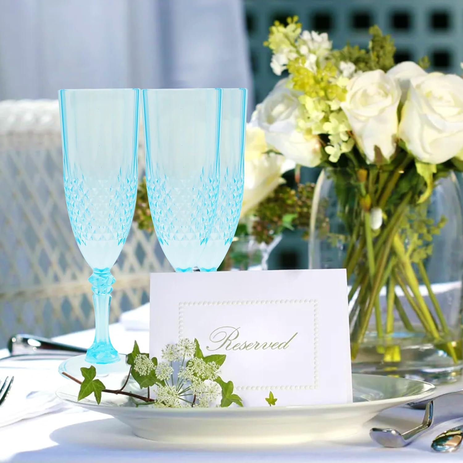 - Charming Set: Champagne flutes set include 48 retro-style light cyan blue champagne plastic wine glasses, providing ample quantity to meet your daily use and replacement needs. A suitable champagne cup is the icing on the cake. Plastic wine glasses not only carry the wine, but also carries the laughter and blessings
