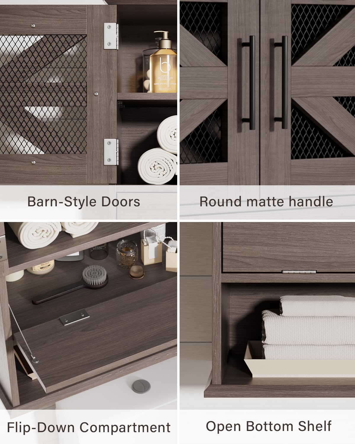 - 【FSC-certified wood】Made with FSC-certified wood in a warm gray-brown tone, this rustic bathroom cabinet blends sustainable materials with timeless charm and functional design.
