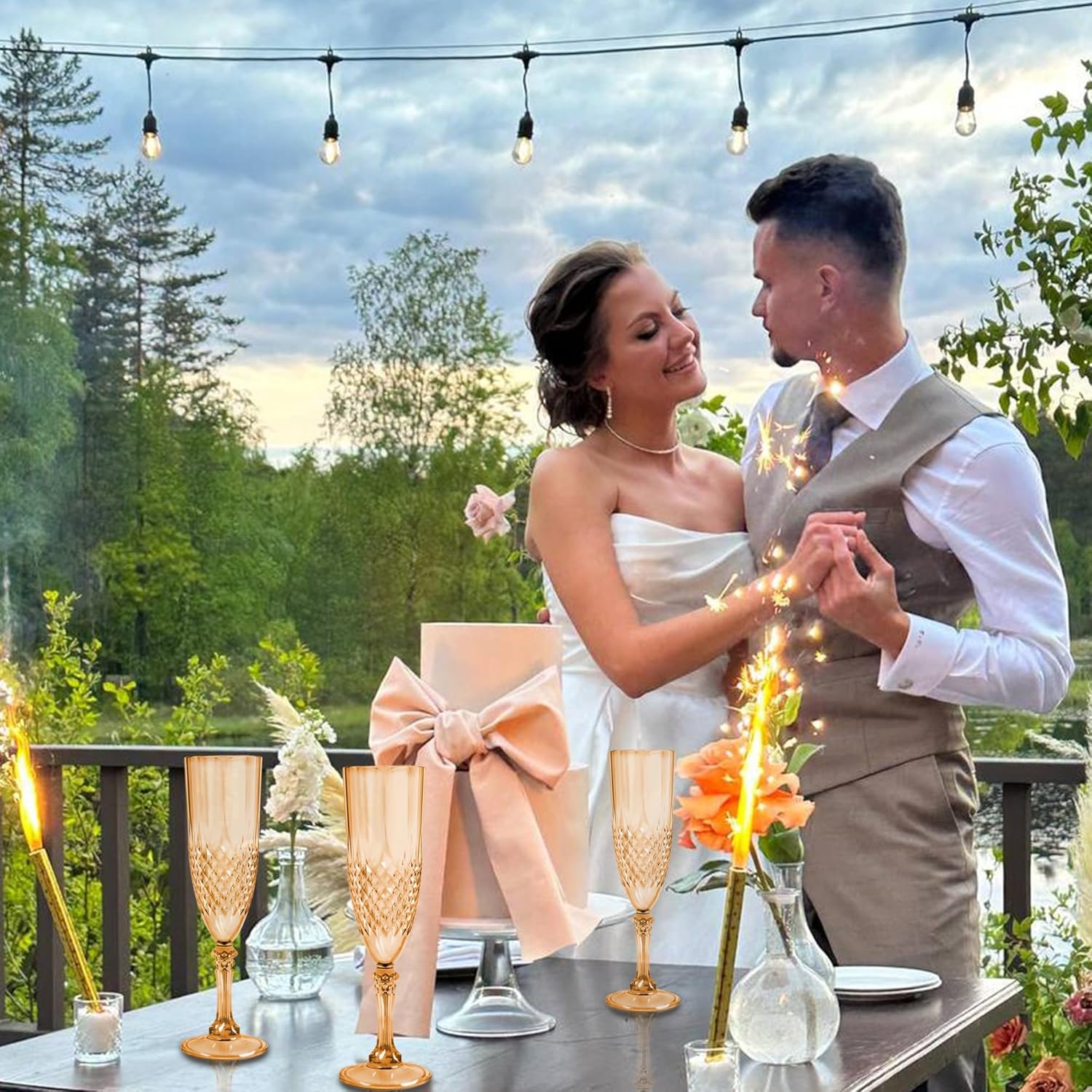 - Charming Set: Champagne flutes set include 24 retro-style gold champagne plastic wine glasses, providing ample quantity to meet your daily use and replacement needs. A suitable champagne cup is the icing on the cake. Plastic wine glasses not only carry the wine, but also carries the laughter and blessings