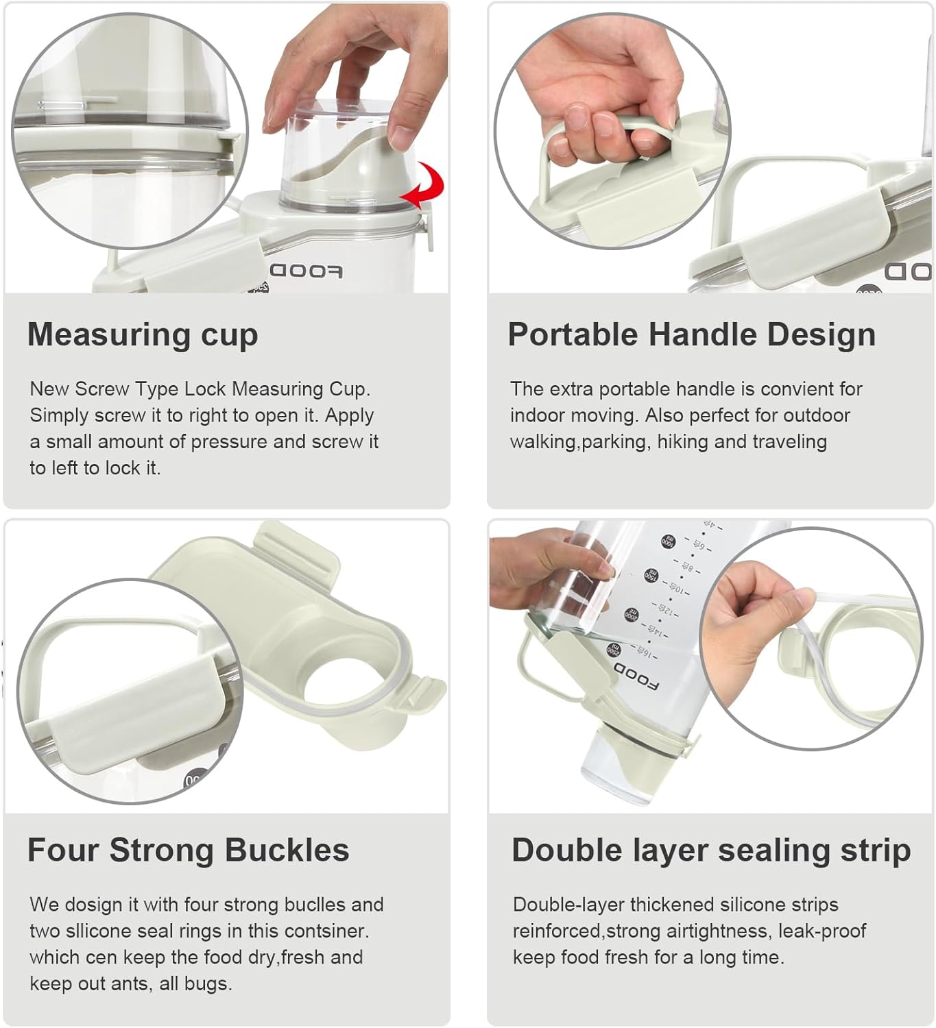 - CLEAR RICE HOLDER:The clear pet food container allows you to identify the contents at a glance,clear visibility and better organization.the cereal dispenser will keep your kitchen pantry neat and organized.there is also a portable handle for easy movement and going out