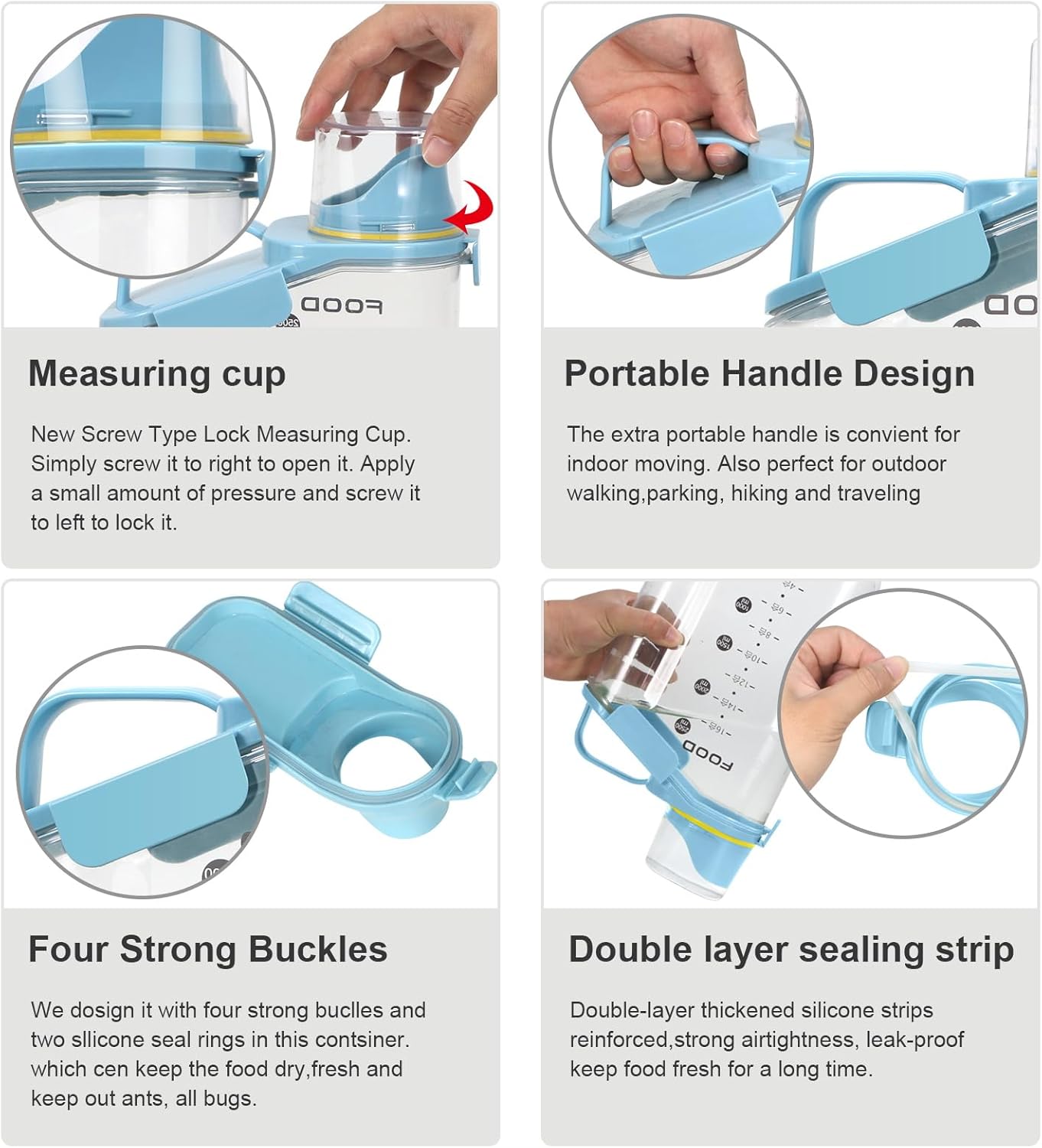 - CLEAR RICE HOLDER:The clear pet food container allows you to identify the contents at a glance,clear visibility and better organization.the cereal dispenser will keep your kitchen pantry neat and organized.there is also a portable handle for easy movement and going out