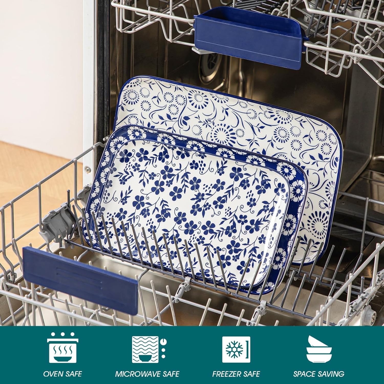 vancasso Serving Platters Set of 3, 16"/14"/12" Inch Rectangular Trays - Serving Platter Extra Large, Ceramic Serving Dish Microwave & Dishwasher Safe (Vintage Blue B)