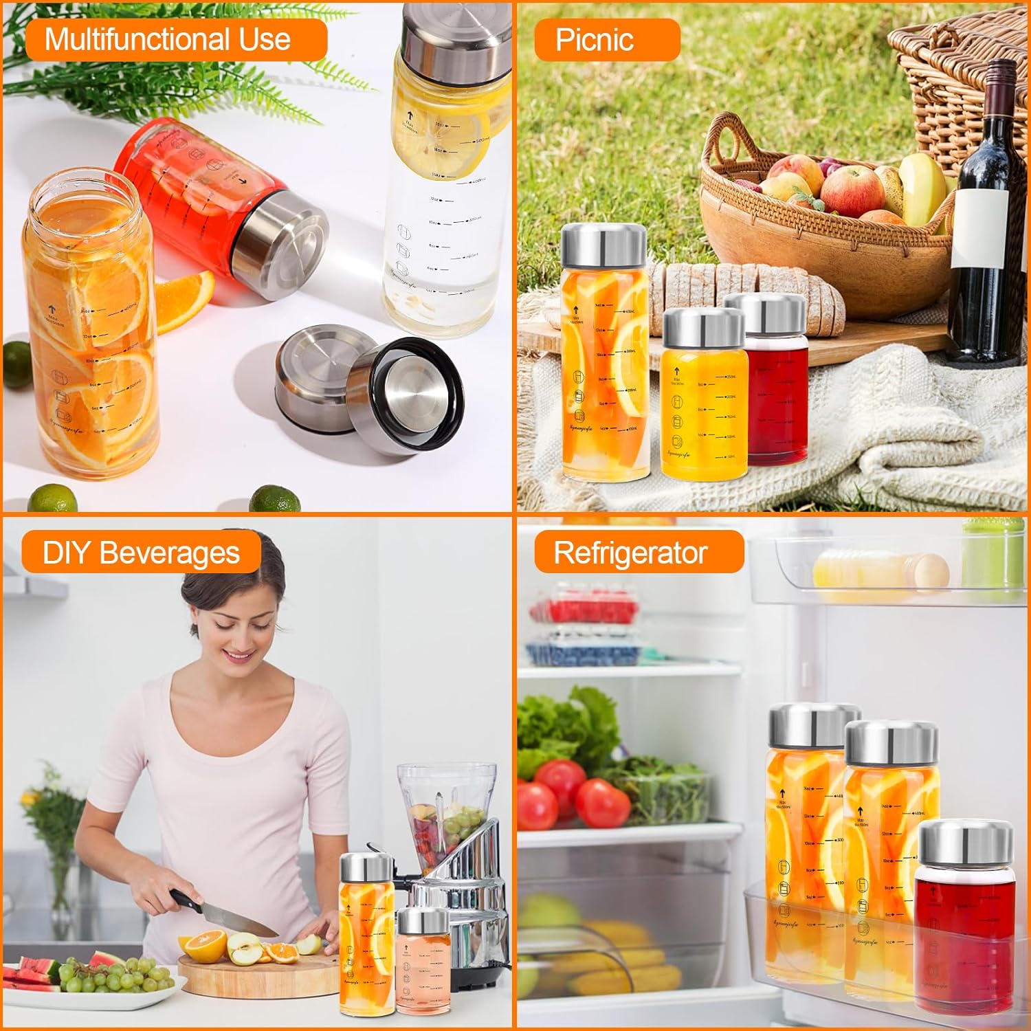 - 2. Versatility Meets Convenience: With wide mouths and convenient measurement markings, our bottles are designed for ease of use. Whether you're blending up a post-workout protein shake, whipping up a fruity smoothie, or storing homemade juice for later, these bottles offer unmatched versatility and convenience.