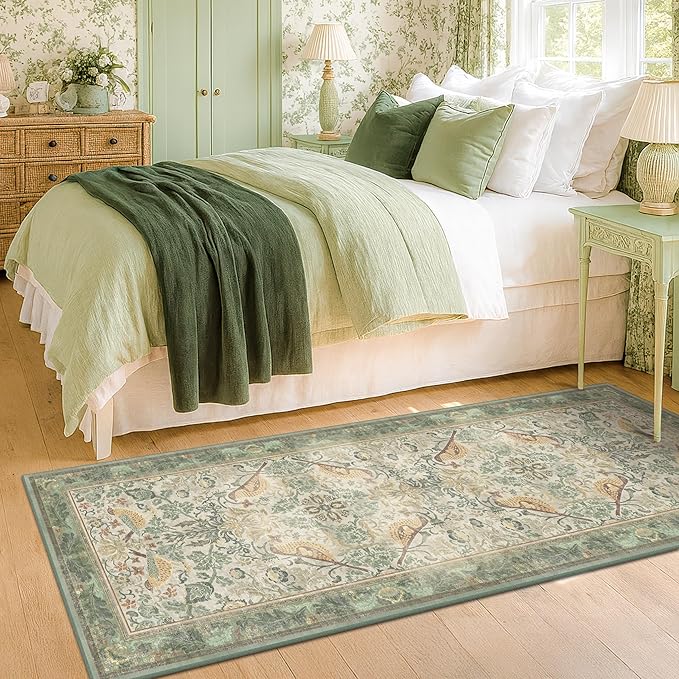 - Victorian Elegance: This vintage-style rug features a mirrored pair of songbirds nestled among intricate botanical motifs. Soft sage green, muted gold, and warm ivory tones give it a gently faded, antique look. The ornate florals and leafy vines create a romantic, nature-inspired design ideal for cottagecore, traditional, or maximalist interiors. Perfect for adding storybook charm and elegance to any room